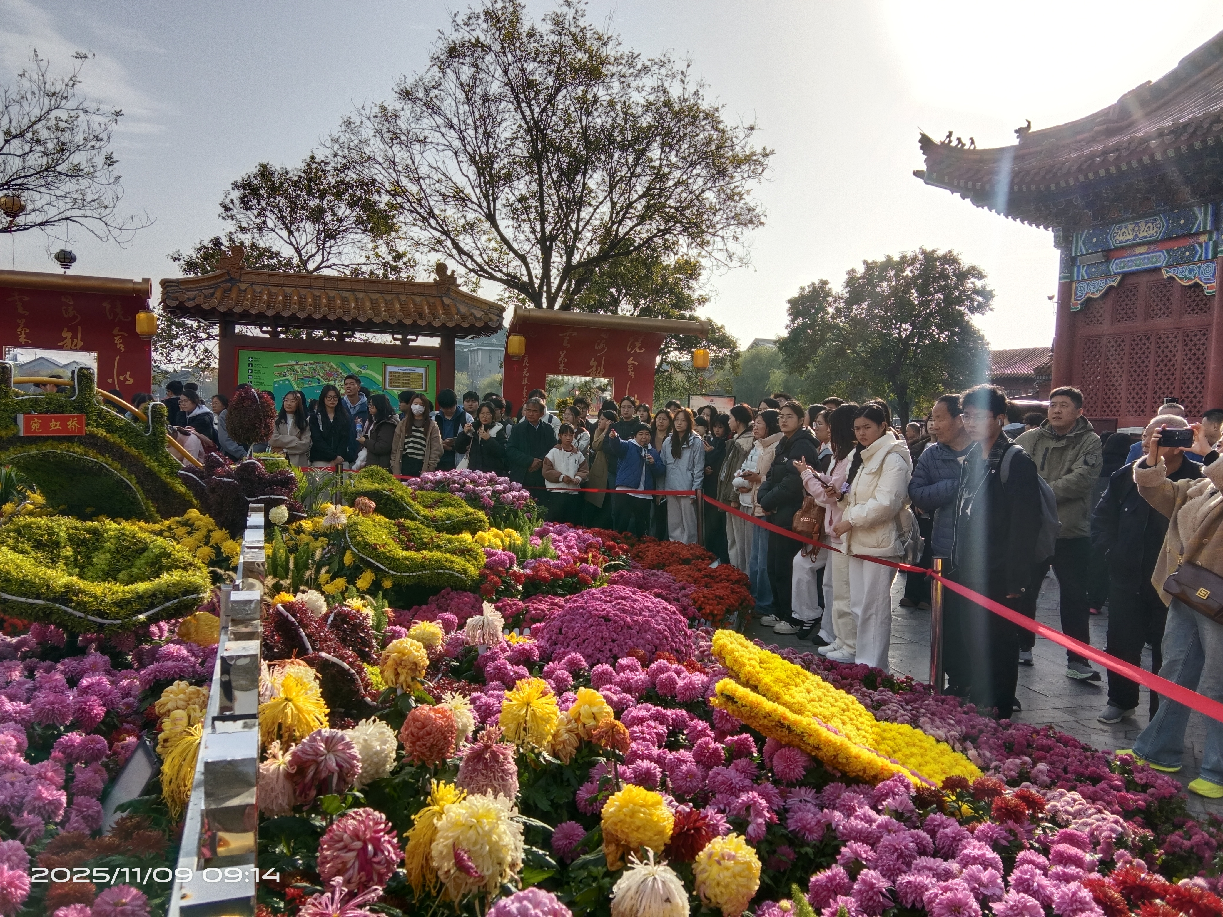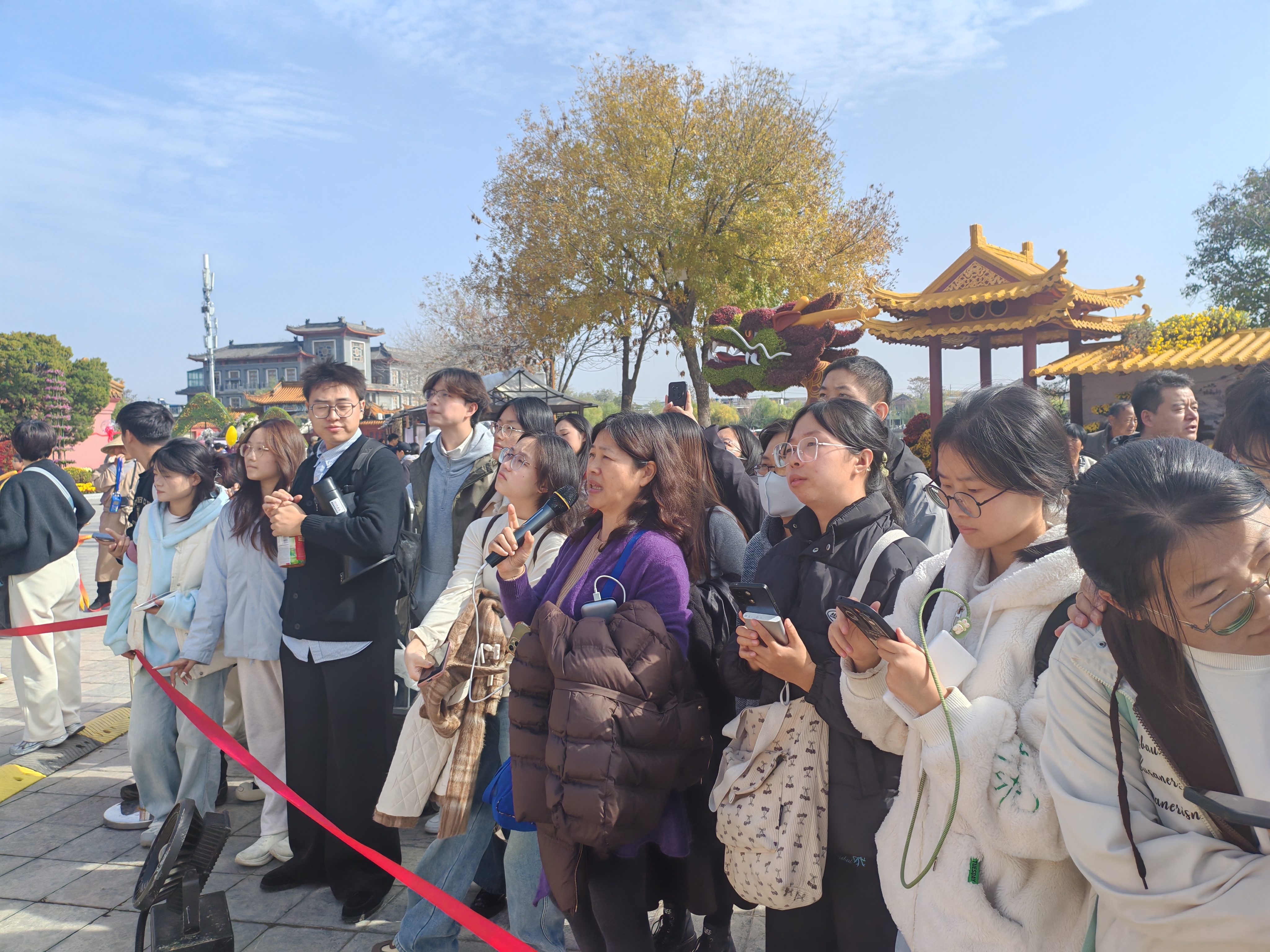 龙亭公园作为中国菊花文化的重要承载地,恰逢第43届中国开封菊花文化节与第十五届中国菊花展览会同时举办,园内40万盆精品菊花与数千个珍稀品种竞相绽放,为本次实习提供了得天独厚的学习环境。漫步其中,同学们欣赏到了“荷包蛋”的灵动、“方便面”的别致、“朱迪”的精巧等特色艺菊,这些菊花与古色古香的宋式建筑交相辉映,生动展现了“菊韵宋风”的深厚文化底蕴。这场集观赏体验、文化传承与科技展示于一体的国家级菊艺盛会,让同学们大开眼界。