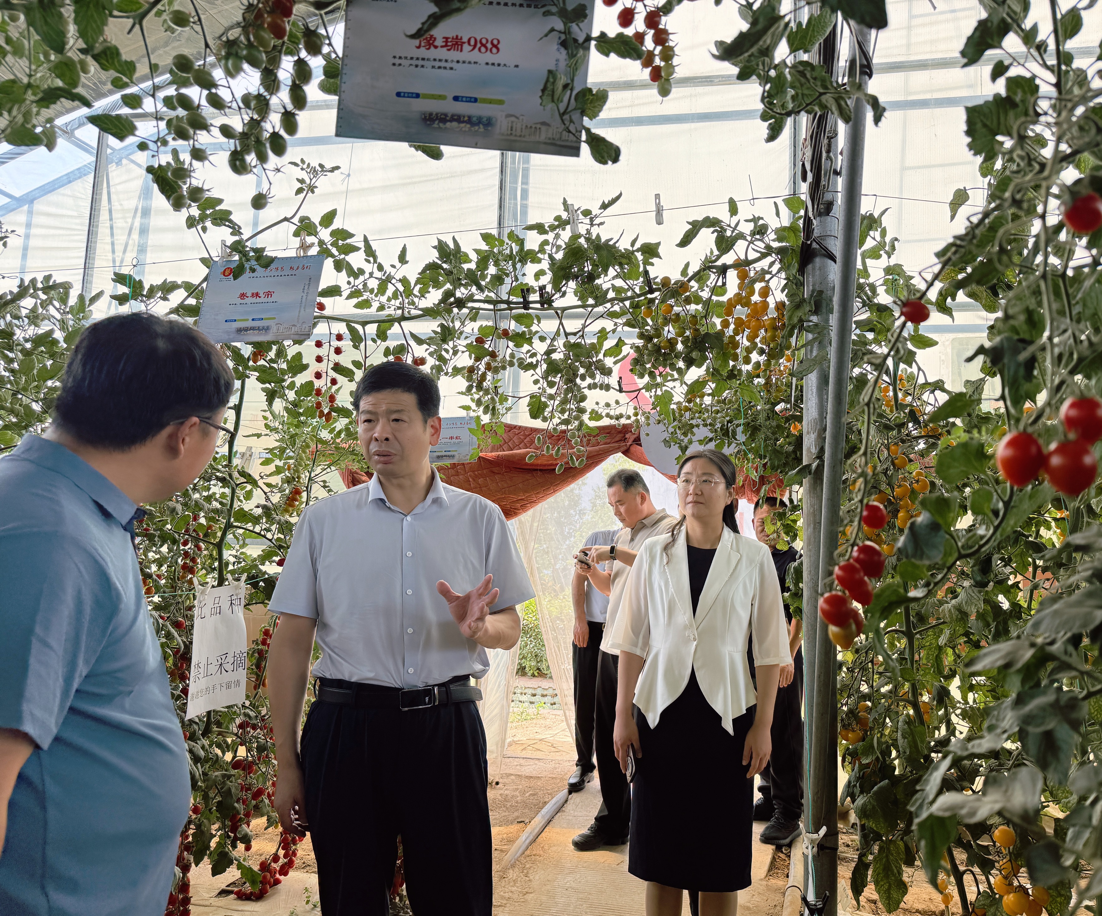 在焦作马村优质果蔬科教园区,焦作市马村区副区长张东方、马村区农业农村局局长薛恒来陪同调研了马村优质果蔬科教园区的番茄、辣椒等试验基地,河南豫艺种业科技发展有限公司总经理赵志坤详细介绍了马村优质果蔬科技园区的发展历程以及母校河南农业大学给予的支持。在河南赛诺优农科技有限公司,一行人参观了产品研发中心公司。听取了总经理赵建介绍企业的发展历程、产业布局及人才需求方向,园艺学院设工系教师张涛汇报了校企联合项目研究进展情况。