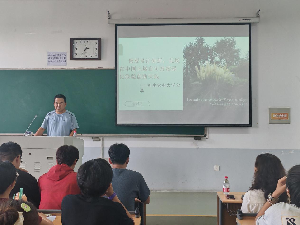 讲座伊始,余兴卫以花境在城市景观创新设计应用实践——助力城市美好为切入点,分享了花园与花境的美好代表了城市灵魂这一观点。随后,以花境营建新技术及低管控成本详细讲解了花境植物配置要求、植物选择与搭配、花境设计与施工和效果。讲座尾声,余光创分享了自身的求学和创业经历以及获得全国五一劳动奖章的心路历程。为同学们专业的未来走向与自我发展定位提供了指导建议。