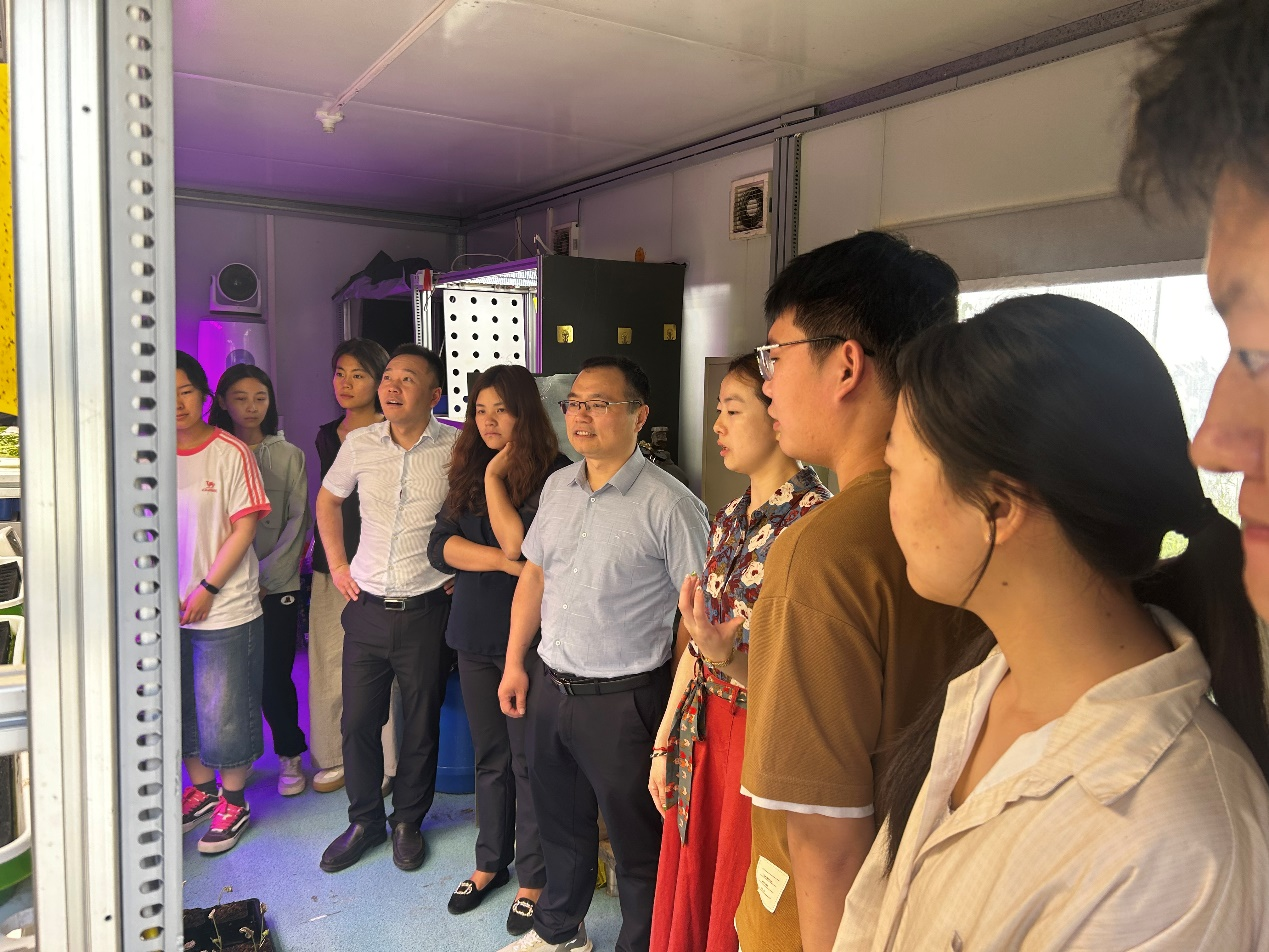 胡建斌一行考察了集装箱植物工厂、垂直无人植物工厂、植物育种加速器,并与在都市所实习的学生进行座谈,勉励学生利用好在都市所实习的优越条件,学习现代设施农业知识,提升专业技能。指导教师张涛要求实习生们勤思考、多请教、多动手,提前做好人生职业规划,抓紧机遇增强自己的就业本领。(撰文/张涛 审核/余果 发布/许娜娜)