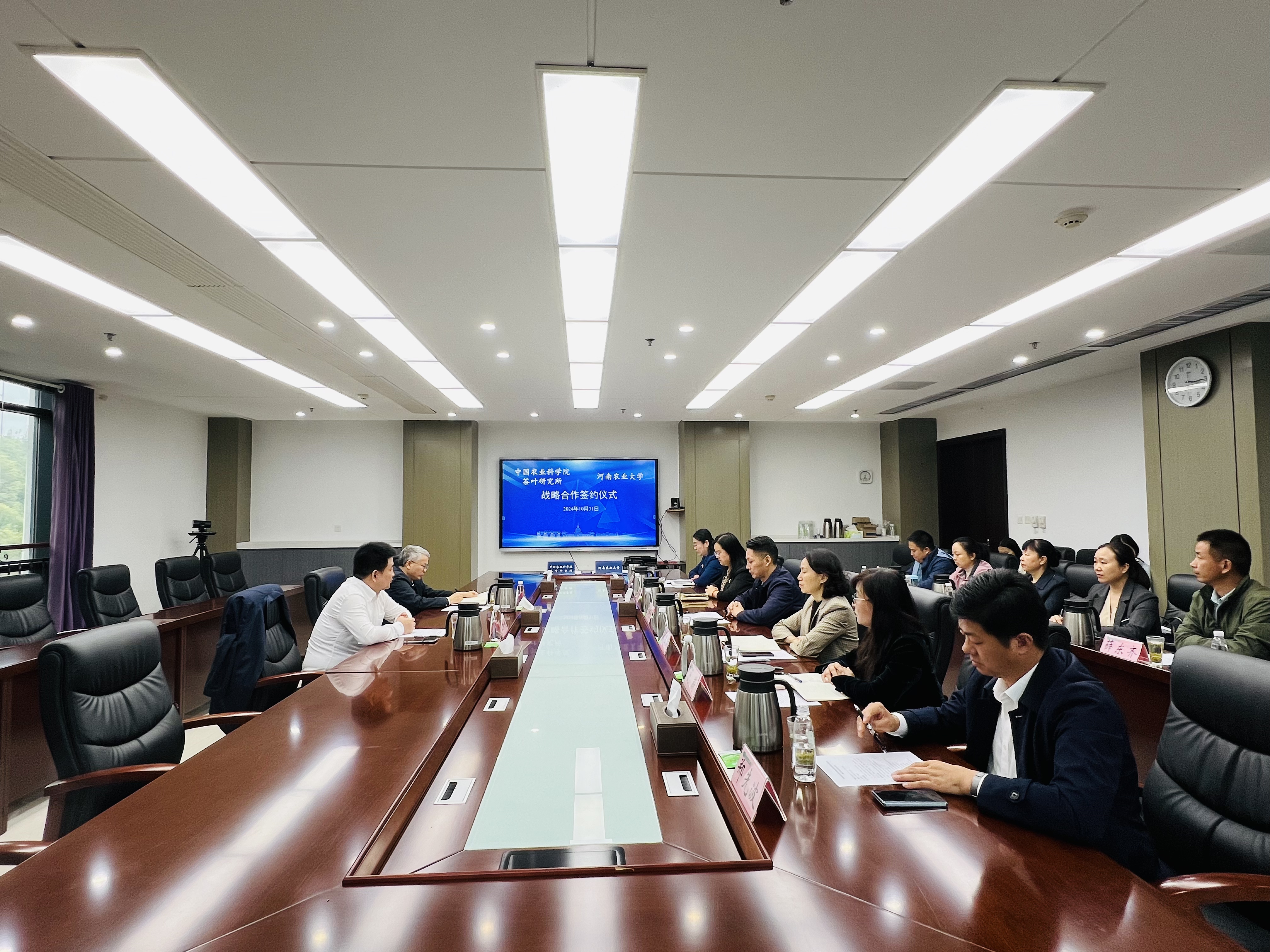 10月31日下午,河南农业大学与中国农业科学院茶叶研究所战略合作签约仪式在河南农业大学综合楼318会议室举行。副校长刘晓永、中国农业科学院茶叶研究所纪委书记、副所长王新超出席签约仪式。中国农业科学院茶叶研究所、学校社会服务处、中国现代农业联合研究生院筹建办、发展规划处相关负责人、园艺学院领导班子及中层干部参加会议。园艺学院党委书记秦素玲主持签约仪式。