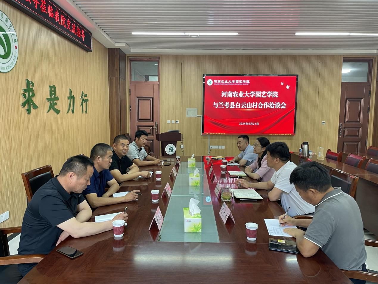 5月24日,兰考县白云山村支部书记陈保超携班子成员一行4人来我院洽谈合作事宜。学院党委书记秦素玲、院长郑先波和马长生教授、张涛老师等参加会议。