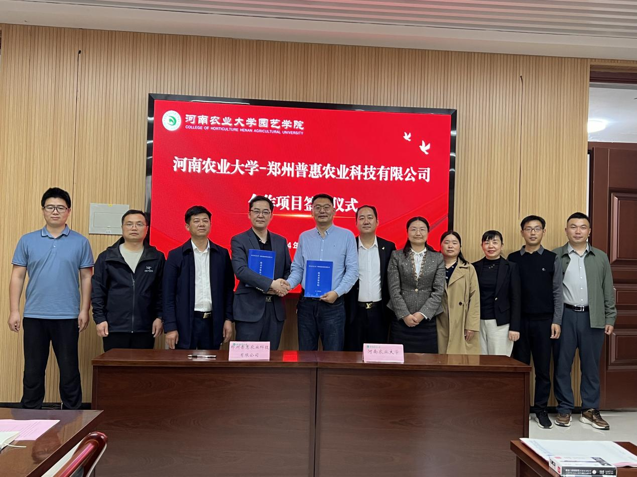 4月19日,我院与郑州普惠农业科技有限公司合作签约仪式在龙子湖校区举行。社会服务处副处长王春丽、园艺学院领导班子、郑州普惠农业科技有限公司总经理韩帅、董事段海涛和瓜类作物基因组与分子育种团队成员参加。会议由园艺学院党委书记秦素玲主持。