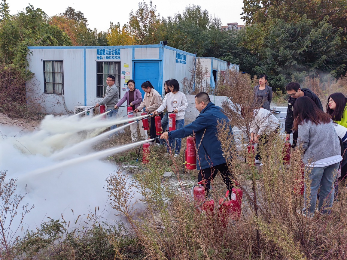 培训和仪式的第三个阶段是学院组织师生在通风良好且空旷的力行楼前西北角空地进行了消防演练。由学院消防监督员王林忠老师现场为新进教师和研究生讲解并演示灭火器和灭火毯的实际操作方法。老师和学生们按照一摇、二提、三拔、四握、五压的程序,逐一演练正确使用灭火器的方法和步骤。通过真实模拟灭火演练,不仅达到了师生能够熟练操作灭火器的目的,也切实提高了大家在突发事件下的应急反应能力。