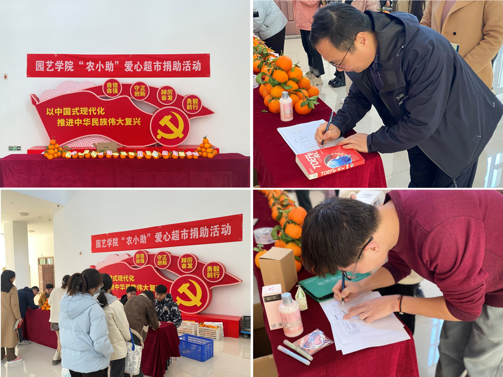 为培养我院研究生的绿色低碳理念,促进广大青年学生广泛参与社会志愿服务,12月5日下午14:00在力行楼一楼大厅,我院举行了研究生“农小助”爱心超市捐助活动。园艺学院副院长胡建斌教授亲临活动现场参与捐赠活动。