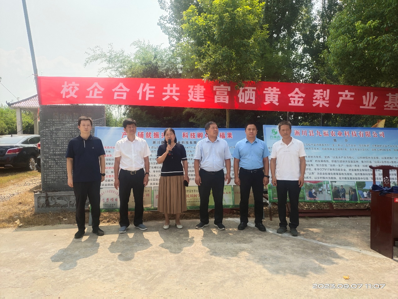 为深入推进产教融合、校企合作,提升学校的社会服务能力和水平,打造产教融合育人新模式。9月7日上午,在淅川县九福农业科技有限公司举行了“科技部、教育部、河南农业大学新农村发展研究院、淅川富硒梨产业基地”签约暨授牌仪式。河南农业大学社会服务处副处长王春丽、园艺学院副院长郑先波、淅川县党组成员副县长吴春刚等相关领导和企业相关人员出席此次签约活动。