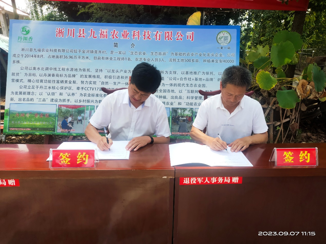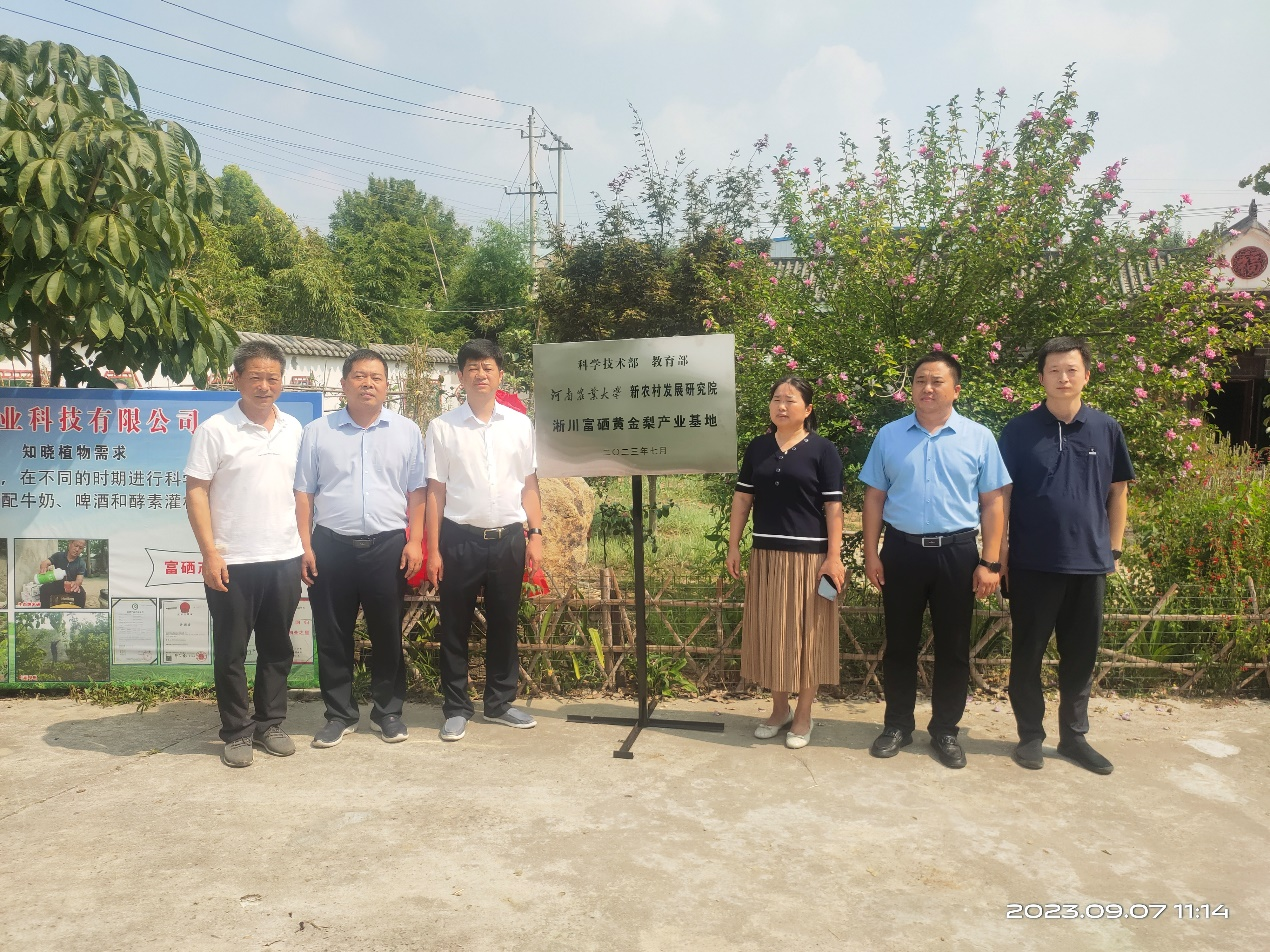 接着,园艺学院与九福农业签署了淅川富硒梨产业基地共建协议。最后,在大家的见证下,双方共同为基地揭牌。