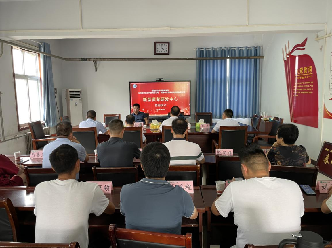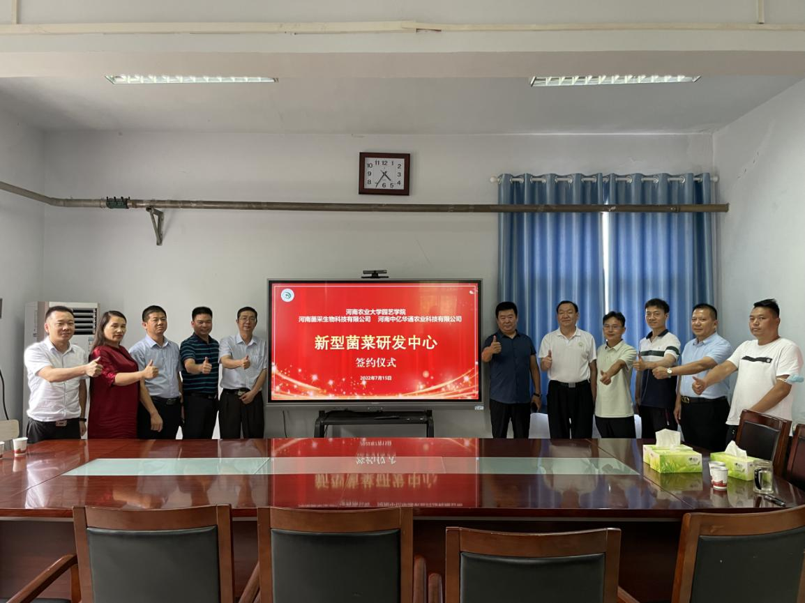 为响应国家乡村振兴、发展高效农业的号召,推进产教融合,促进食用菌产业发展。7月16日下午,园艺学院与河南菌采生物科技有限公司、河南中亿华通农业科技有限公司联合成立新型菌菜研发中心,在文化路校区举行签约仪式。园艺学院党委书记杨喜洲、院长孙守如、副院长郑先波,河南菌采生物科技有限公司、河南中亿华通农业科技有限公司董事长何永涛、总经理卢爽出席,园艺学院和公司相关负责人参加。仪式由杨喜洲主持。