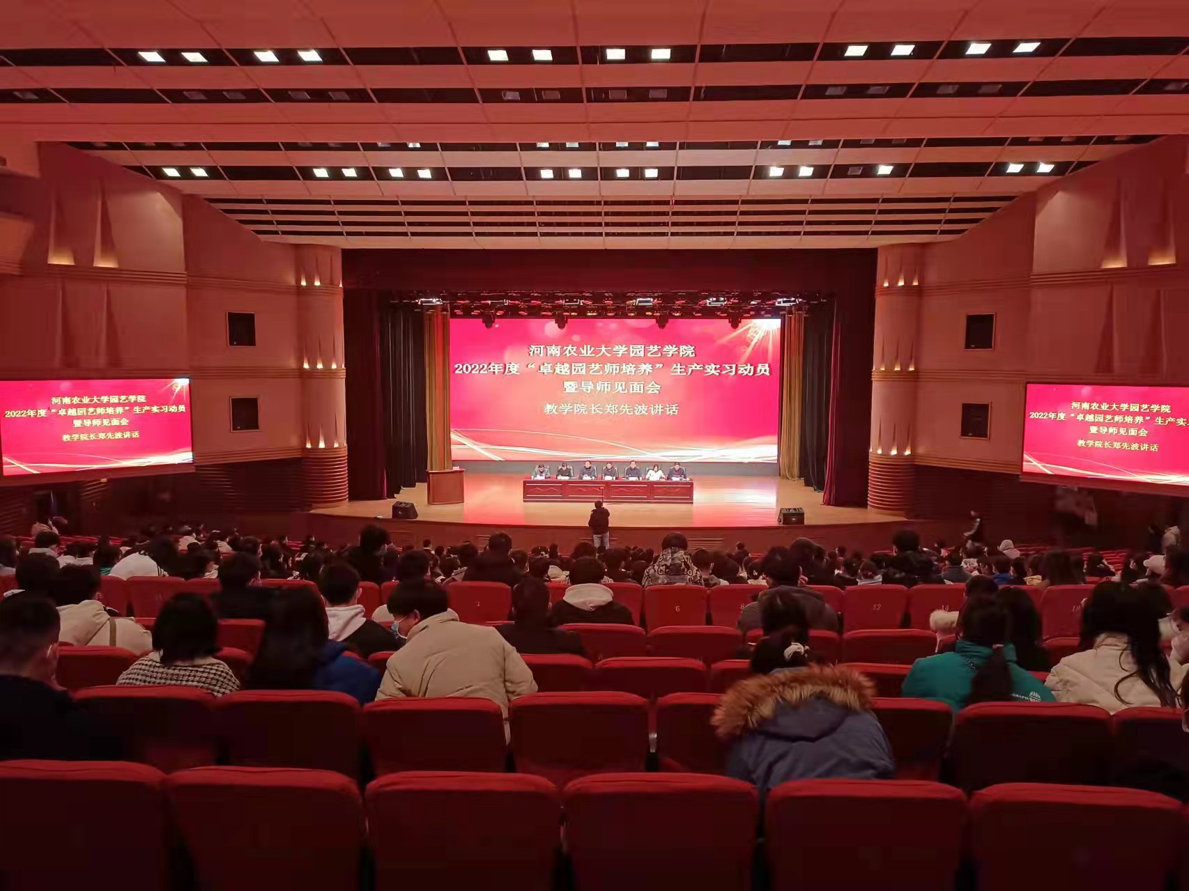 为更好地指导学生参加生产实习,2月22日下午,经过精心筹划和认真准备,园艺学院在文化路校区千人大礼堂隆重召开2022年度“卓越园艺师培养”生产实习动员暨导师见面会。学院领导班子成员、全体实习指导教师以及园艺学院19级全体本科生参加了动员会。同时,许昌校区19级园艺技术与工程专业学生通过线上的方式参加了此次会议。