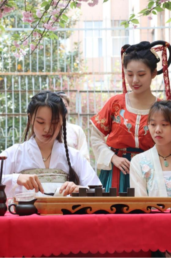 此次活动在优美的汉服舞蹈中拉开帷幕,共分为赏樱花、品香茗、秀樱花、展樱花、戏樱花五部分。活动伊始,樱花小道旁展出了一系列樱花绘画、书法、摄影作品以及对樱花知识的介绍,吸引了在场观众的目光,纷纷驻足观看,并由两位汉服解说员为大家讲解,使同学们可以从各个角度欣赏樱花的美。紧接着,是我院茶轩社的茶艺表演节目,一人讲解、一人表演,配合默契地为观众献上妙趣十足的茶艺展示,加深了现场师生对茶的了解。同时,也可在旁品尝樱花甜品,茶与甜品的碰撞,绽放出了全新的活力。此外,我院艺术团带来了舞蹈表演《吹梦到西州》和《归去来兮辞》、二胡表演《赛马》以及古筝表演《紫竹调》,展现了园艺学子的活力青春,现场人流如织,热闹非凡。樱花树下学党史环节,通过知识竞答以及党史知识分享来增强学生的爱国情怀,传承红色基因,向建党100周年献礼!