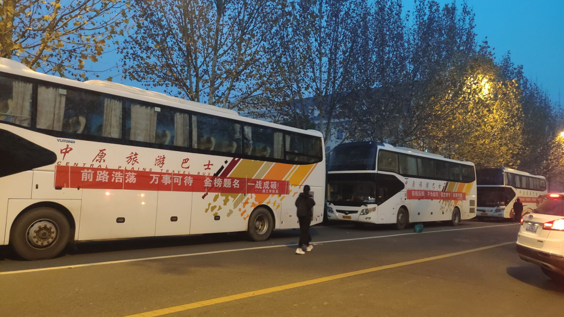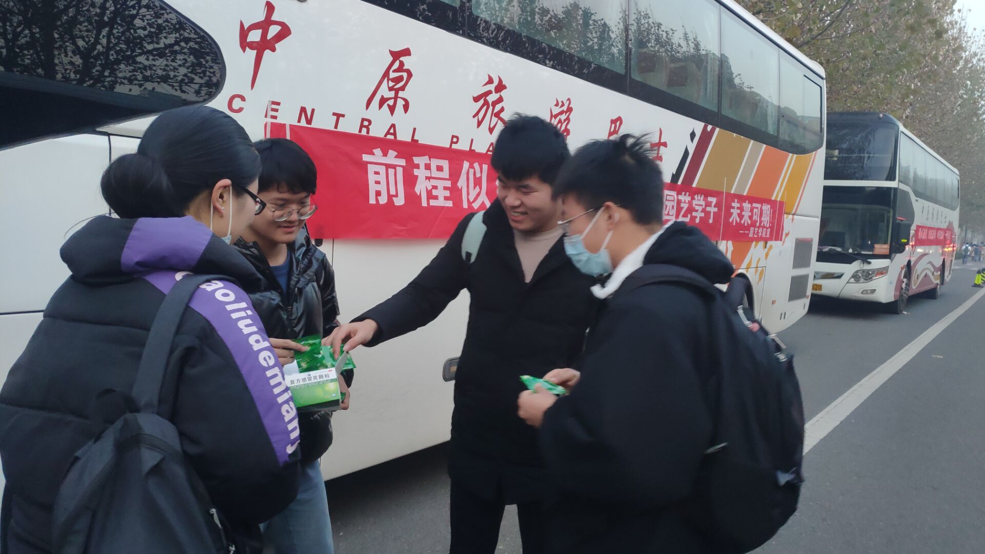 因今年我校研究生招生考试全部在龙子湖校区进行,我院毕业生集中于文化路校区分布,学院统筹安排三辆大巴车于考研期间往返新老校区接送考研学子,全力支持学子考研。12月26号早上6点,三辆贴有园艺学院横幅的大巴车达到文化路校区整装待发,毕业生辅导员冯帅老师全程跟车服务为同学们带来关怀鼓励,院党委副书记毛会坡7点前就抵达龙子湖校区接车,为同学们加油鼓劲。前期考虑到有部分同学晕车,早上吃晕车药有嗜睡等副作用影响考试发挥,便提前一天将购买的“晕车贴”发放到学生手中。同时为考研学子准备999感冒灵、抗病毒口服液、板蓝根颗粒冲剂、口罩、体温计等相关防护药品和防疫物资。同时每辆车建立工作QQ群,对考研的各项准备工作都进行认真细致、饱含温情的安排与提醒,将考研必备物品及注意事项逐个梳理列出清单,让广大园艺学子深切体会到学院的关爱和温情。