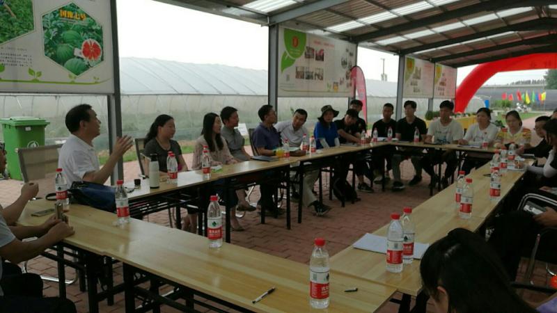 下午,支部成员来到河南农业大学(扶沟)蔬菜研究院看望了实习生,并进行了面对面谈话。实习生们分别对自己的实习情况进行了汇报,并和自己的指导老师针对毕业论文设计进行讨论,最后孙守如、马长生和胡建斌教授分别进行了总结,并针对出现的问题提出了相应的建议。接着,支部成员观摩了研究院展示的蔬菜新优品种。先是参观了新选育的番茄和辣椒品种,小小的茎枝上挂着密密麻麻的番茄、辣椒,不但品质优良,而且产量非常高,不断给人以视觉冲击。例如 “卷珠帘”、“巧克力”、“芒果”等番茄新品种,“西北旅一尺长”、“大象螺丝椒”、“G细线椒”、“椒之玉”等辣椒新品种,形态各异,品质俱佳。紧接着,仔细参观了各种西瓜和甜瓜品种,最吸引眼球的属“彩虹瓜之宝”西瓜,其瓤色红橙、乳黄相间、犹如彩虹,入口即化的特点让人流连忘返、回味无穷。此外,“黄金三号”(黄皮红肉)西瓜品种和“豫甜脆又脆”、“金凤凰”等甜瓜品种各具特色。