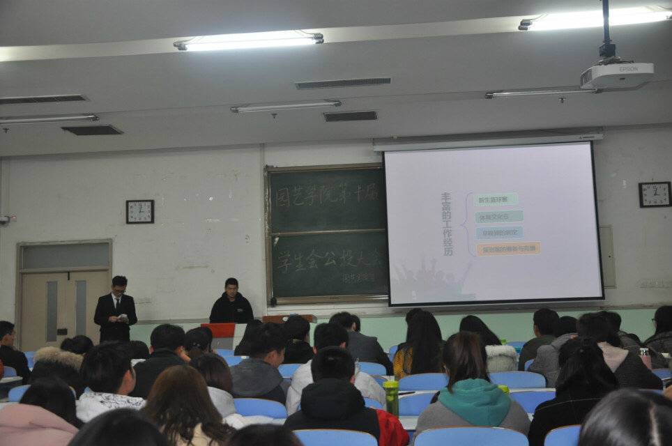 2018年3月6日下午,园艺学院在工程楼成功举办第十届学生会公选大会。园艺学院党委副书记侯亚兵,团委副书记冯帅,辅导员黄婉珺、陈桃,以及学生会成员、团委干事和班级代表等人参加本次竞选大会。