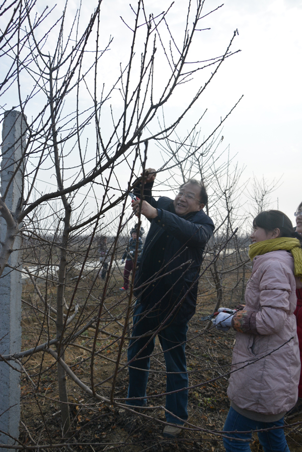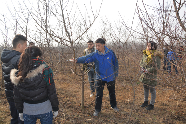 该教学科研基地共占地1200余亩,地内种有桃,梨,葡萄,杏,石榴等果树品种,由于过去管理比较粗放,目前树体长势旺盛,树型原始杂乱,正适合学生学习掌握修剪知识和技术,学院今年共安排实习学生189人,分两批进驻基地,完成果树冬季修剪教学实习任务。