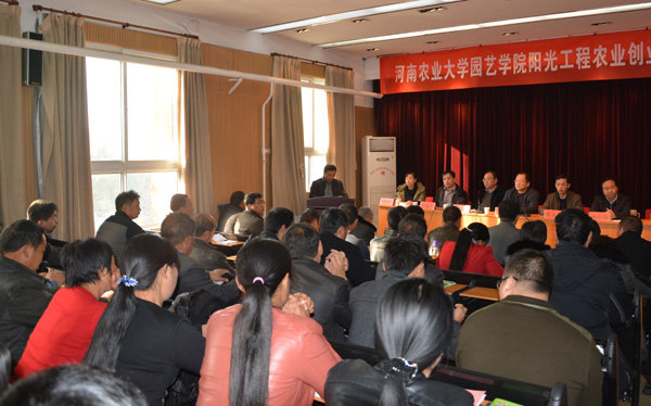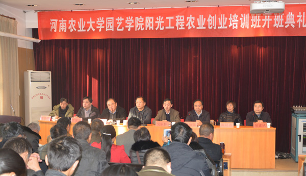 秋尽冬已至,岁暮天渐寒。在这阳光和煦、微风轻扬的初冬时节,河南农业大学园艺学院2013年阳光工程农业创业培训开班典礼于11月18日上午在文化路校区2号楼4楼报告厅隆重举行。园艺学院党委书记耿超明、校地方合作处副处长吴永林、鹤壁市农业局副局长朱志清,园艺学院副院长孙治强出席了典礼仪式,校地方合作处、鹤壁市农业局和园艺学院相关人员以及来自鹤壁、巩义和郑州郊区的培训班学员参加了仪式,典礼仪式由园艺学院副院长孙治强主持。