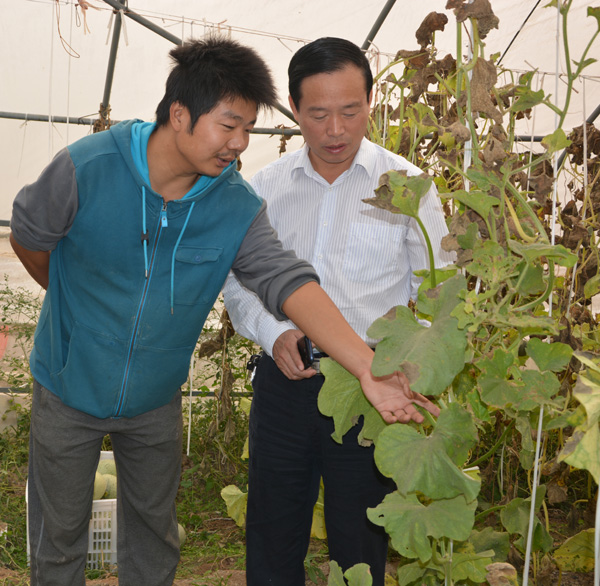 杨书记首先对王朋朋的创业过程和收效给予了充分肯定,指出王鹏鹏在创业过程中,既提高了能力,增加了经济效益,同时还带动了当地农民一起致富,为社会发展做出了积极贡献;他的创业历程对学校卓越园艺师培养是个很好的探索,为卓越园艺师培养提供了很好实践场所,给学弟学妹们提供了很好的学习锻炼机会,值得发杨;并且,随着创业范围的不断拓宽,业务量不断增加,宣传了河南农业大学,有益于扩大学校的社会影响;强调大学生创业不仅仅是简单的生产过程,要在生产过程中不断思考,要有创新,这样才能体现出大学生创业与农民种地的差别,要把创业和创新结合起来事业才会有好的发展前景,才能充分发挥大学生创业的优势,同时告诫王朋朋等人:“河南农业大学创业产品形象店”在运营过程中,一定要保证绿色蔬菜和瓜果的质量,诚信经营,不能做任何有损学校声誉的事情;最后,杨书记就蔬菜的套种模式对病虫害防治的作用和食品安全等问题与随行者进行了意见交流和探讨,还亲切地寻问了王朋朋等人目前的实际困难并积极帮助解决。