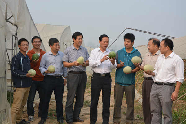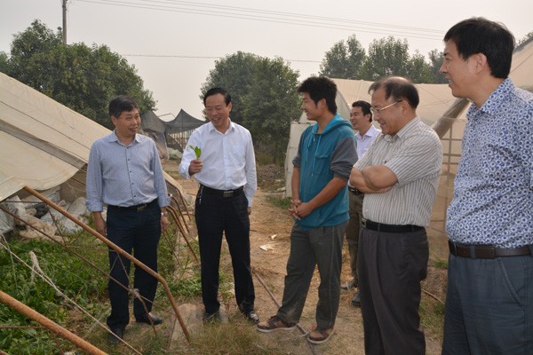 10月9日上午,我校党委副书记杨德东,校招生就业处处长张留湛,园艺学院党委书记耿超明、院长冯建灿一行来到位于郑州北郊黄河滩上的园艺学院2013届毕业生王朋朋团队的创业基地,视察了基地生产经营情况。