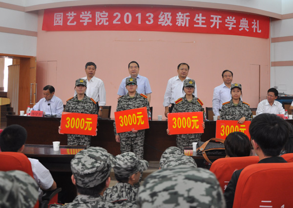 孙守如副院长宣读了2013级优秀新生的表彰决定,并为新生奖学金获得者进行颁奖。教师代表白团辉上台发言,希望同学们在大学四年中学会管理生活、学习,注重提高自己的综合素质,并学会勇于面对困难和挫折、解决生活中的各种困难。在校生代表肖霄对学弟学妹们的到来表示热烈欢迎。新生代表刘高靖发言,表示要珍惜青春努力学习,在四年的大学生活中积极锻炼各种能力,争取成为祖国的栋梁之才,续写园艺学院的光辉成就。