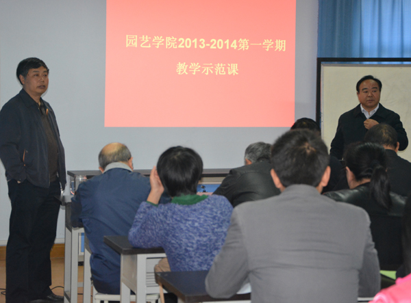 10月28日下午,我院在2号楼413室成功举行园艺学院2013-2014第一学期教学示范课讲评活动。教学示范课讲评活动由院长冯建灿主持,教务处副处长化青报,校级教学督导杨明亮,张玉龙应邀参加了讲评活动,教学示范课分别由蔬菜学科带头人孙治强教授和果树学科带头人吴国良教授主讲,学院全体教师和学生参加了讲评活动。