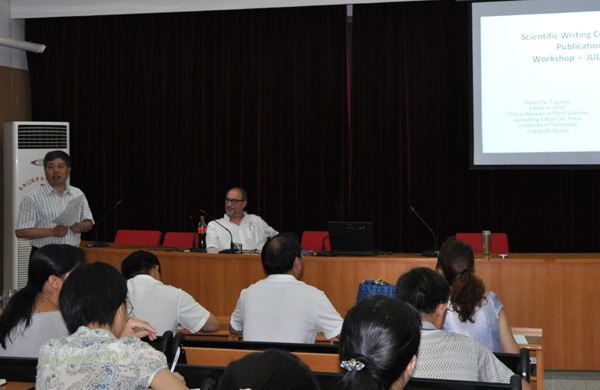 7月1日至2日,美国田纳西大学的Robert N. Trigiano教授在我校文化路校区2号楼4楼报告厅为我校师生做了题为“科技论文写作的方法和技巧”的专题讲座,园艺学院全体教师和在校研究生、校研究生处部分老师和其它兄弟学院的老师和研究生参加了此次讲座活动,该讲座共分四场,为期2天,分别由院长冯建灿教授、副院长孙守如教授和院党委副书记侯亚兵主持。