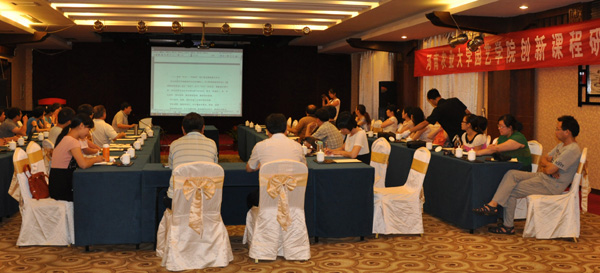 院长冯建灿教授客观地分析了目前农业高等教育面临的大形势和存在的实际问题,指出创新课程建设就是在网络信息化对传统课堂基础知识教学的造成强烈冲击的情况下,面对国内外各大高校激烈的竞争,面对农业在行业竞争中的弱势地位,面对学科发展不均衡的新形势,高等农业教育该如何做才能教好学生?怎样做才能把学生的精力吸引到课堂上来,才能让学生愿意听讲,主动学习,从而掌握一门课程的基本理论知识,为实践技能的提高打下牢固的基础,让学生愿意跟老师学,积极向老师学,课堂上有兴趣学,课堂外主动学,并且让学生感受到跟着老师学习的效果的的确确要好于通过其它渠道学习的效果,从而很好的完成一门核心课程的教学任务,达到最好的教学效果,这是创新课程建设的目标,也是本次研讨会的重点内容和中心任务。随后,学院副院长孙治强教授对研讨会2天的工作进行了详细安排和全面部署,并对每一项工作提出了明确的目标和具体的要求。最后,学院党委书记耿超明对本次研讨会提出明确要求,要求全体与会教师要本着学生缺什么就给学生教什么,学生不愿意学,要想方设法地引导学生去学,学生上课不愿意听,精力不集中,思想不专注,就采用新颖的教学手段,讲授最新最前沿的课程知识等措施,千方百计地吸引学生主动跟着老师学的教育宗旨,认真探索,积极发言,争取把这次研讨会开得圆满成功,具有实效。