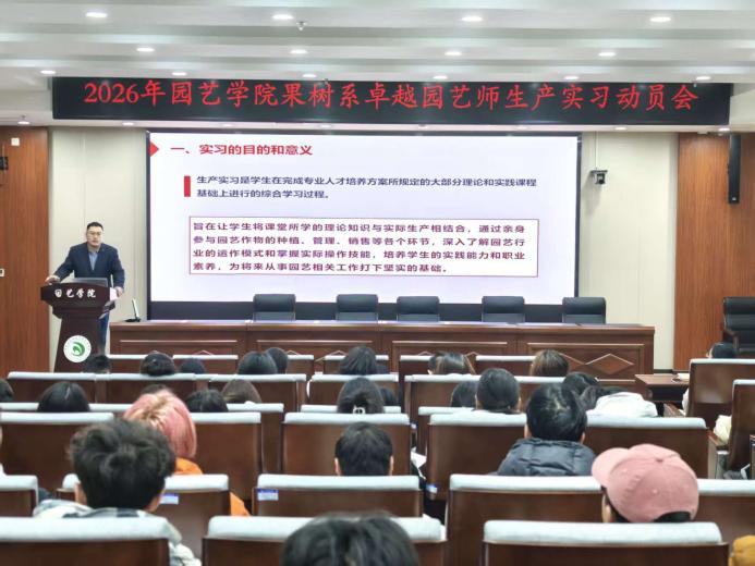 为扎实推进“卓越园艺师培养计划”实习工作,帮助学生明确实习目标、强化安全意识、提升专业实践能力,2026年3月4日上午,园艺学院果树系在第二实验楼北209会议室举行了2023级本科生“卓越园艺师”生产实习动员会。园艺学院副院长谭彬、果树系全体教师及相关实习学生参加会议。