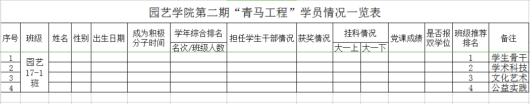“园艺学院第二期青马班”面向我院2017级本科生招收学员,主要面向品学兼优的院学生干部、学生社团干部、入党积极分子、学习骨干及在学术科技、文化体育等方面成绩突出的优秀学生,每期培养学员30名。经“园艺学院青马工程”领导小组审核确定正式成员。