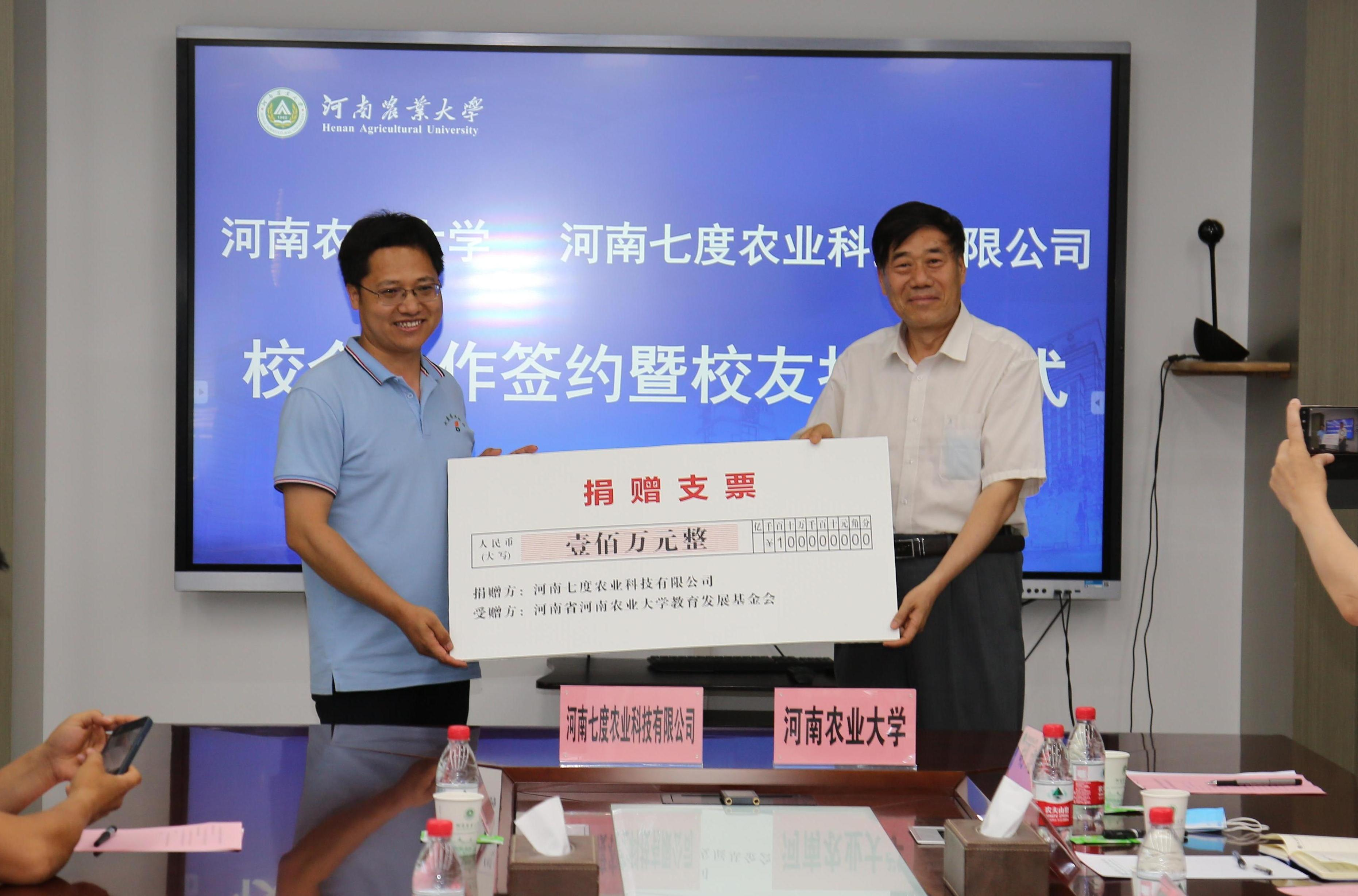 6月6日下午,我校与河南七度农业科技有限公司校企合作签约暨校友捐赠仪式在龙子湖校区举行。副校长康相涛、河南七度农业科技有限公司董事长、园艺学院96级校友李纪锁出席活动。社会服务处、校友联络办公室、学校教育发展基金会、园艺学院及茄科团队教师参加活动。
