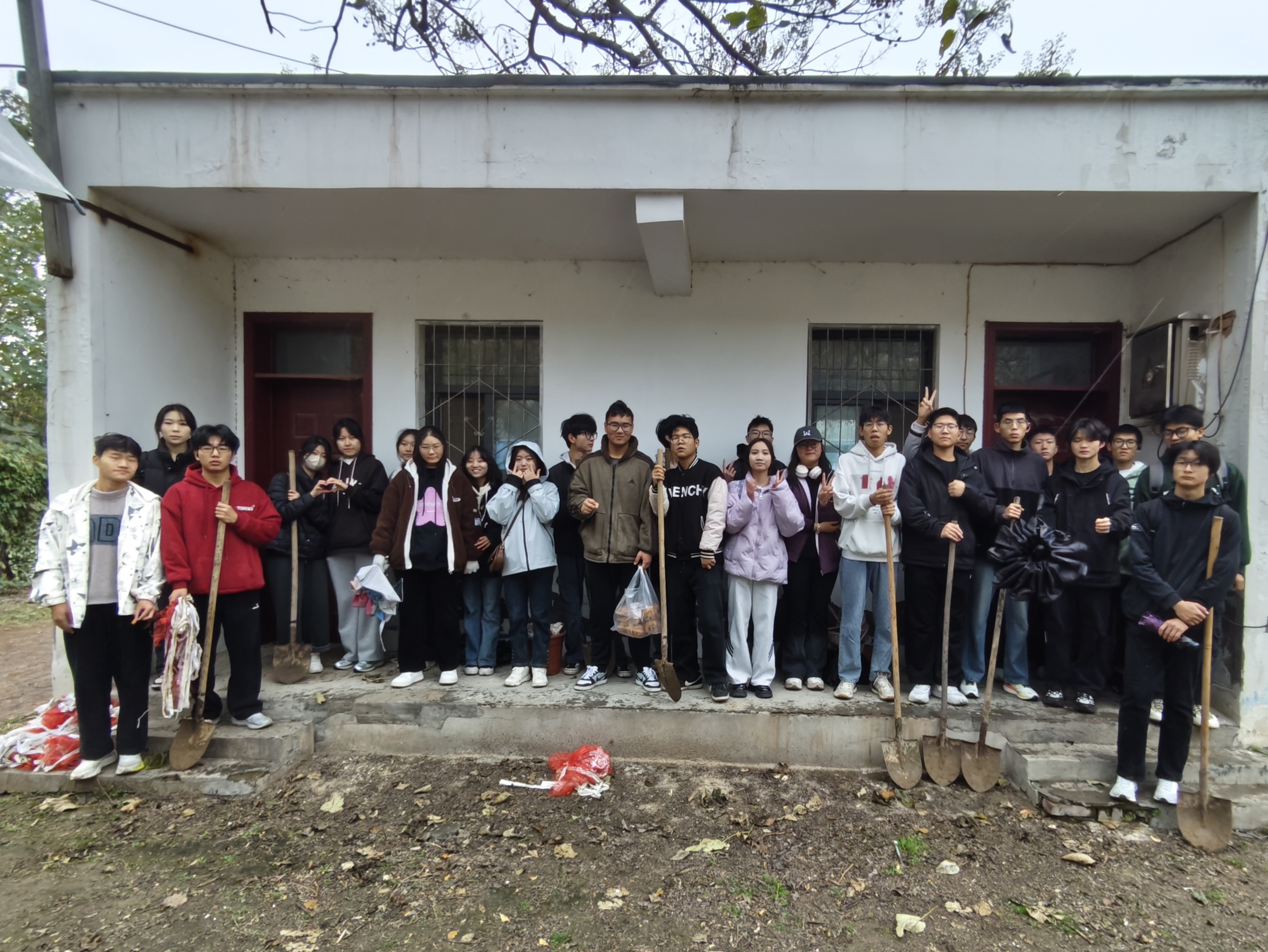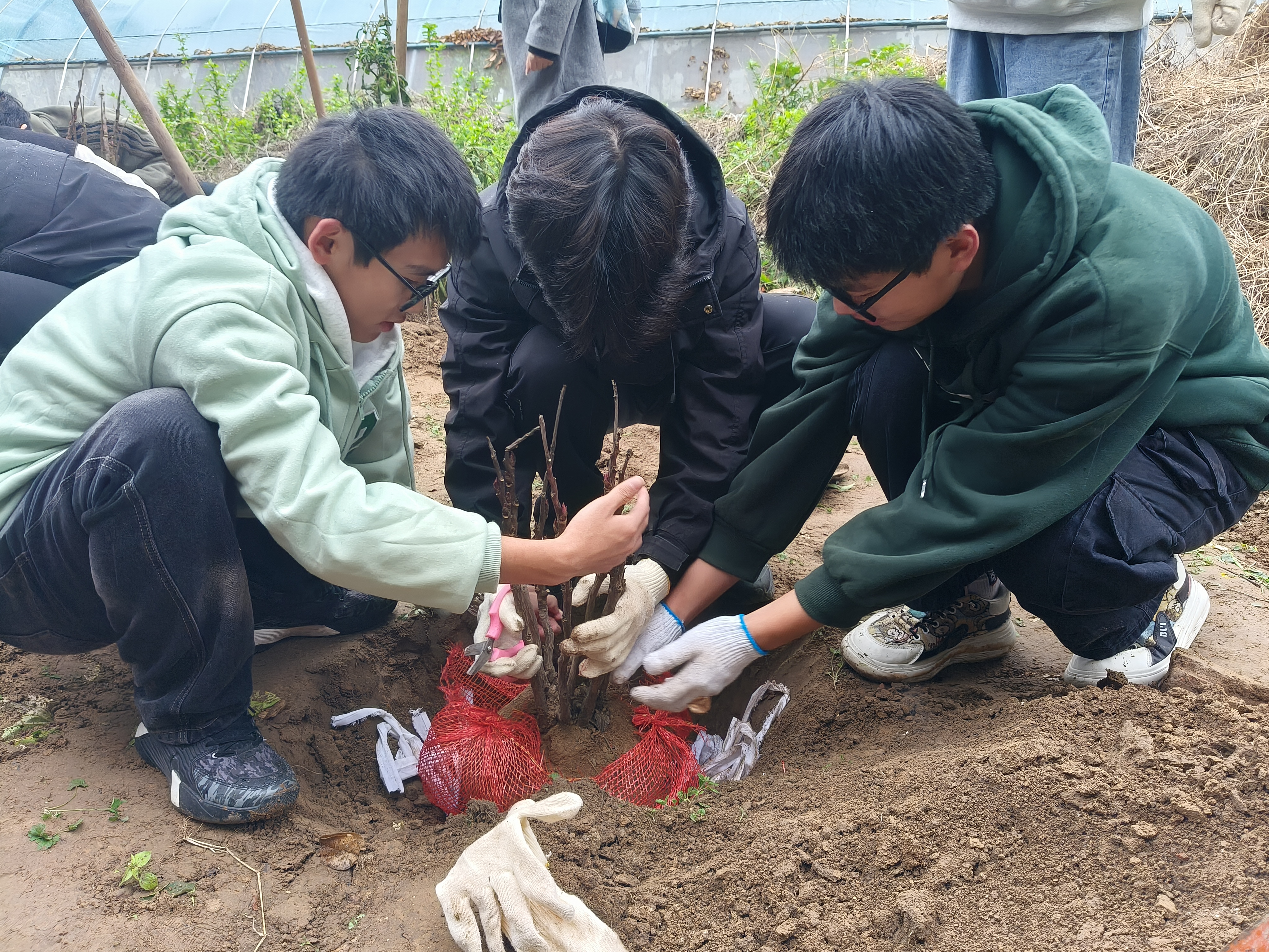 活动伊始,郭鑫向学生讲解了牡丹种植时间的特殊性以及牡丹地栽的步骤,强调了本次劳动教育活动的纪律和注意事项。随后,在他的示范和指导下,学生领取工具分小组进行劳作,一系列的翻地、放牡丹苗、拆网袋、填土等劳动,一个个牡丹苗安然地躺入大地的怀抱,一片空地变成了整齐的牡丹带,只待冬季的低温春化唤醒新生。活动最后,全体同学合影留念。