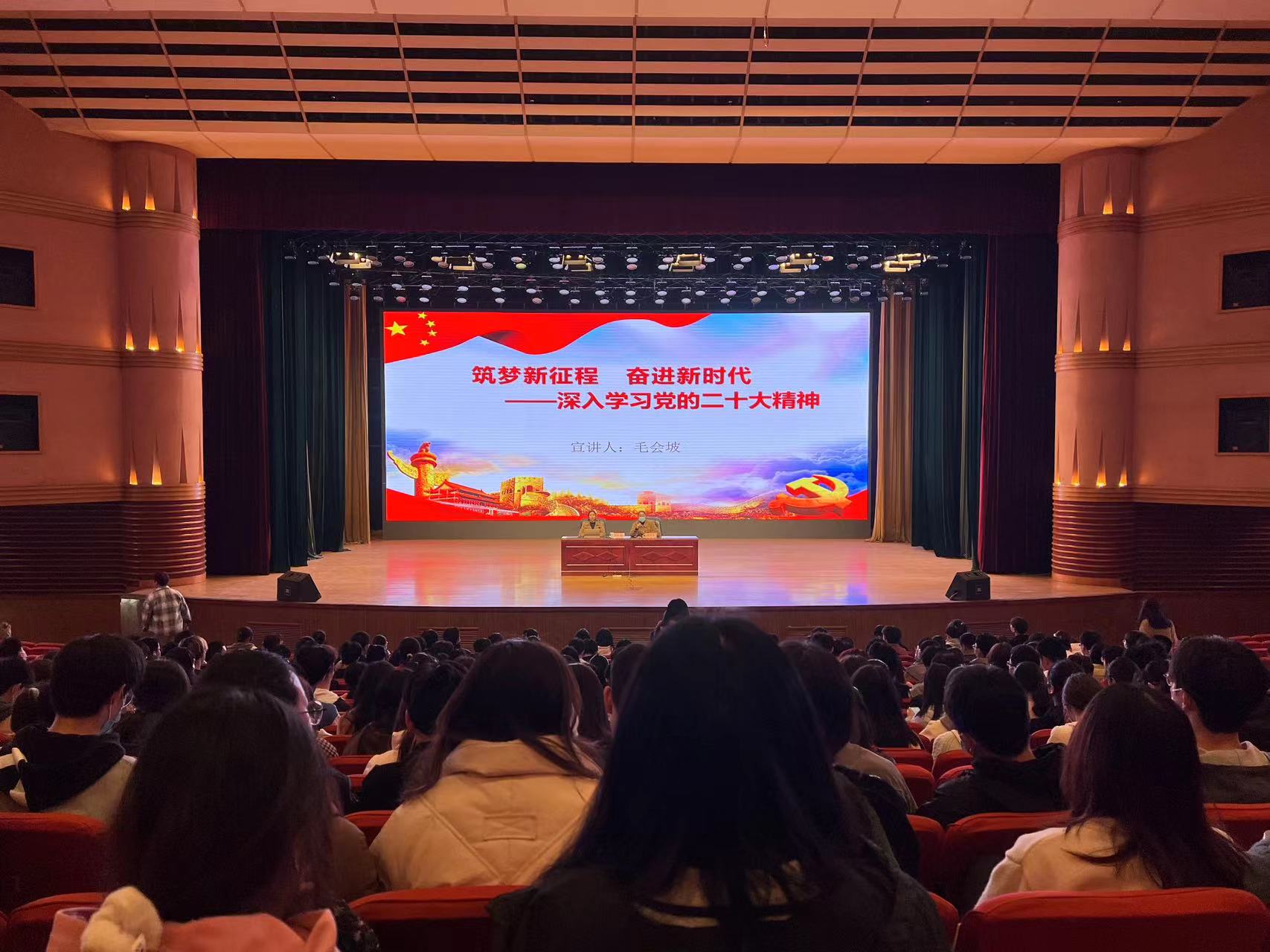 3月21号下午,我院在文化路校区千人大礼堂举办了以“筑梦新征程 奋进新时代”为主题的党的二十大精神宣讲活动,院党委副书记毛会坡作宣讲报告,2022级全体学生参加了本次会议,辅导员乔芳芳主持召开。