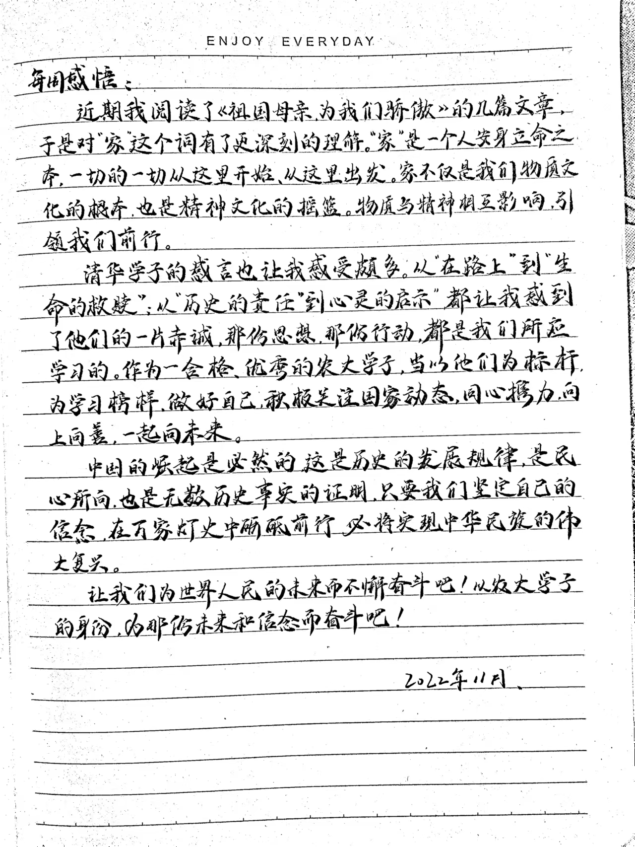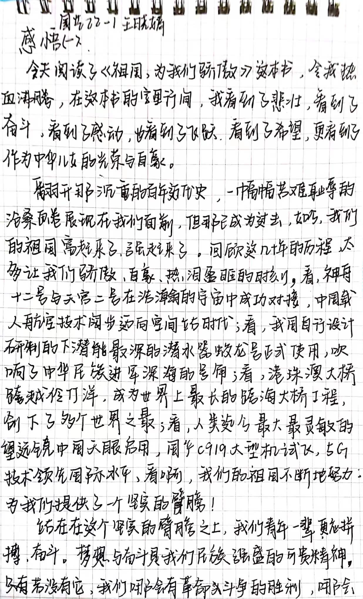 为丰富新生入学教育形式和内涵,我校学生处为各院2022级全体学生班级订购了《祖国母亲,为我们骄傲!——千名清华学子感言录》。我院2022级新生,在班长、团支书的带领下进行了学习与交流,并撰写下自己的所思所感所悟。