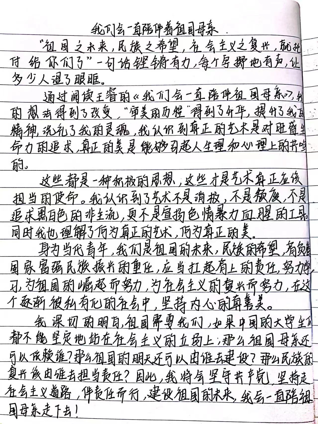 同学们通过读书加深自身底蕴、提高自身修养,感受文字的魅力,联动历史的音符、奏响时代的华丽乐章。翻开沉重的百年近代史,大家从中体会到了奋斗的可贵。同学们从清华学子的真切话语中收获颇丰,不禁握住手中之笔,写下心中之念:“家不仅是我们物质文化的根本,也是精神文化的摇篮”、“这些都是一种积极的思想,这些才是艺术真正应该担当的使命”等。一笔一划都书写着同学们的壮志与理想,诉说着青年学子对国家、对学校的热爱与自豪。