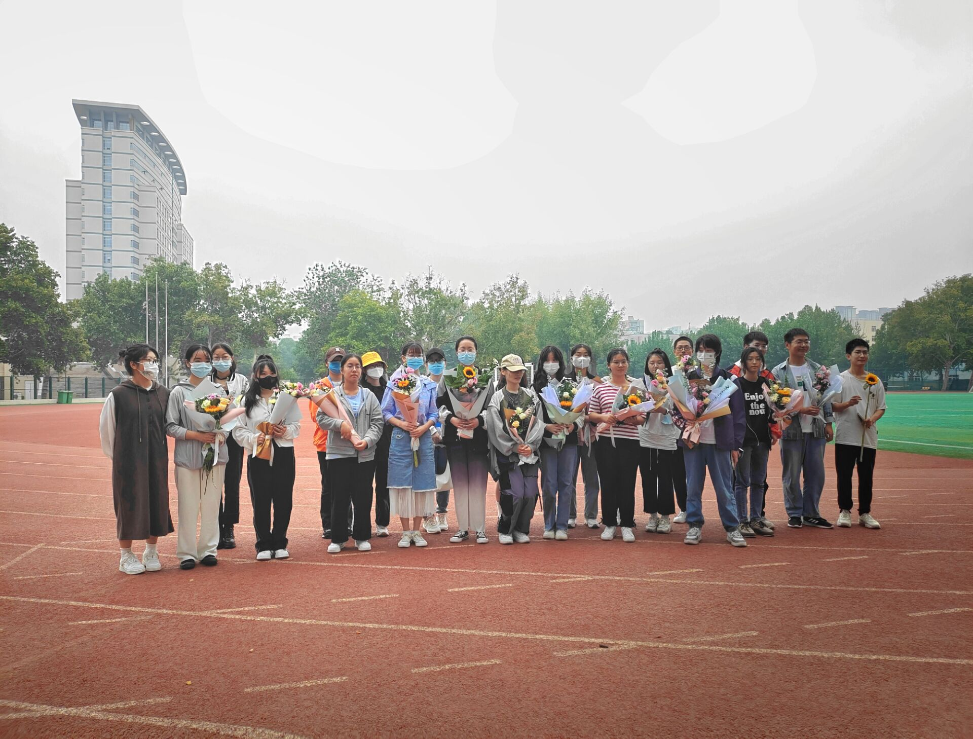 活动最后,花语协会负责人和园艺学院志愿者协会成员一起到校内外将花束赠予国庆假期依旧坚守岗位的工作人员。“点点微光,可聚星河”人民的幸福感和获得感以及国家的繁荣富强都离不开这些工作人员的辛勤付出。