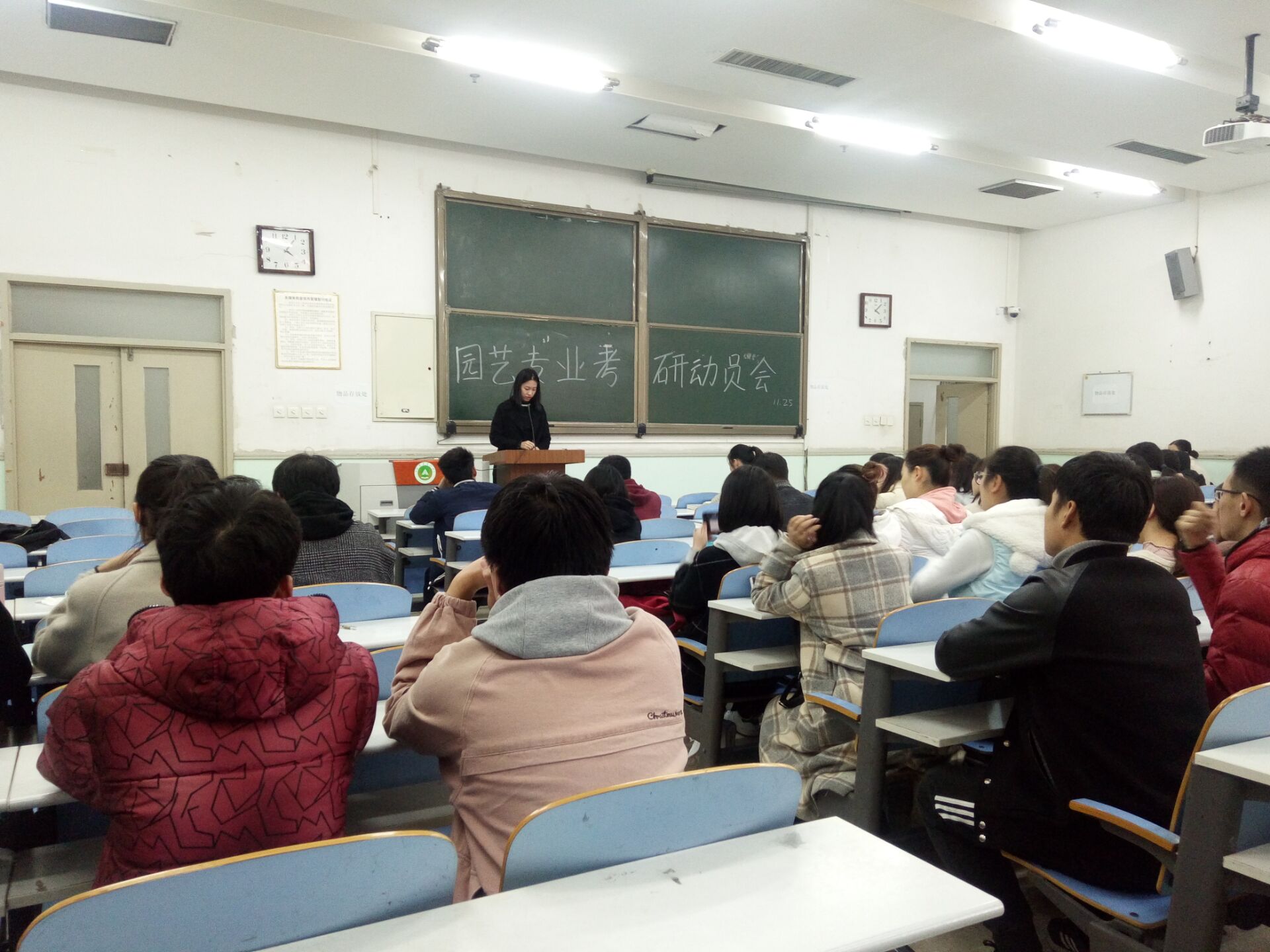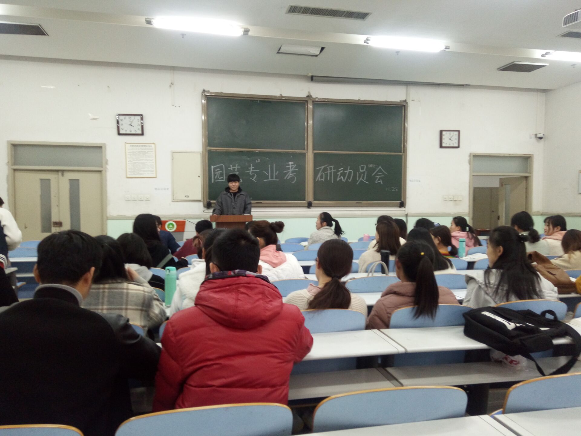 11月25日下午,园艺学院16级园艺专业和设施专业分别于工程楼103、桃西楼303举办考研动员会。果树专业研究生韩金蒙、蔬菜专业研究生王晓娟、设施专业研究生张婵、张亚受邀出席了会议,园艺专业李家桢和设施专业马超,分别主持了本次动员会。