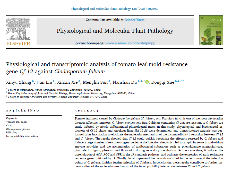 近日,河南农业大学园艺学院茄科抗病抗逆种质创新研究团队在园艺学领域期刊《Physiological and Molecular Plant Pathology》发表了题为“Physiological and transcriptomic analysis of tomato leaf mold resistance gene Cf-12 against Cladosporium fulvum” 的研究论文。研究对Cf-12及其敲除植株Slcf-12-28 在抗性生理、生化及转录水平上的差异进行了表征,研究结果丰富了Cfs基因响应叶霉病侵染的抗性生理。
