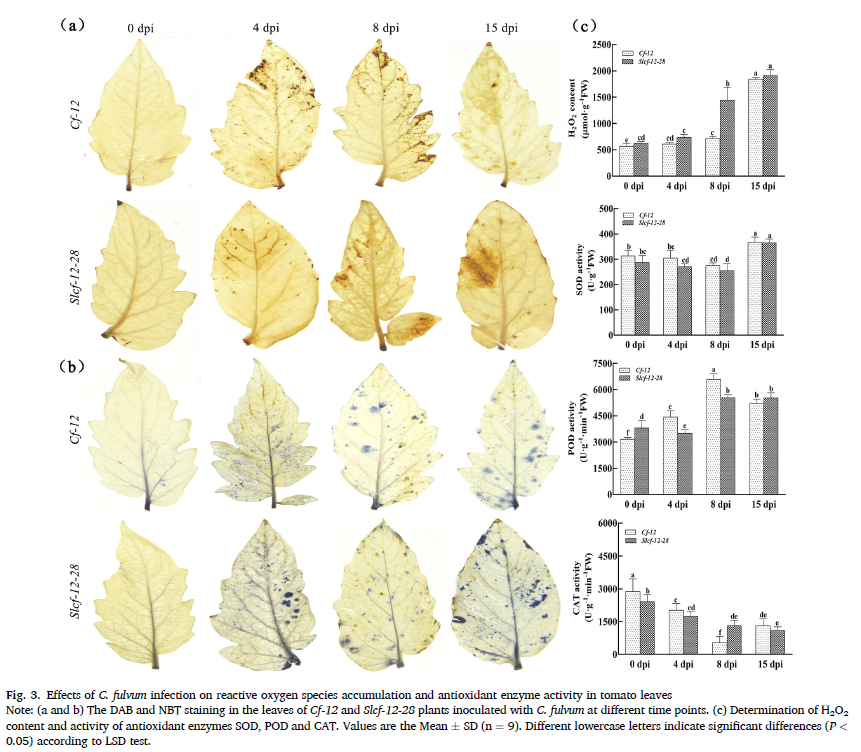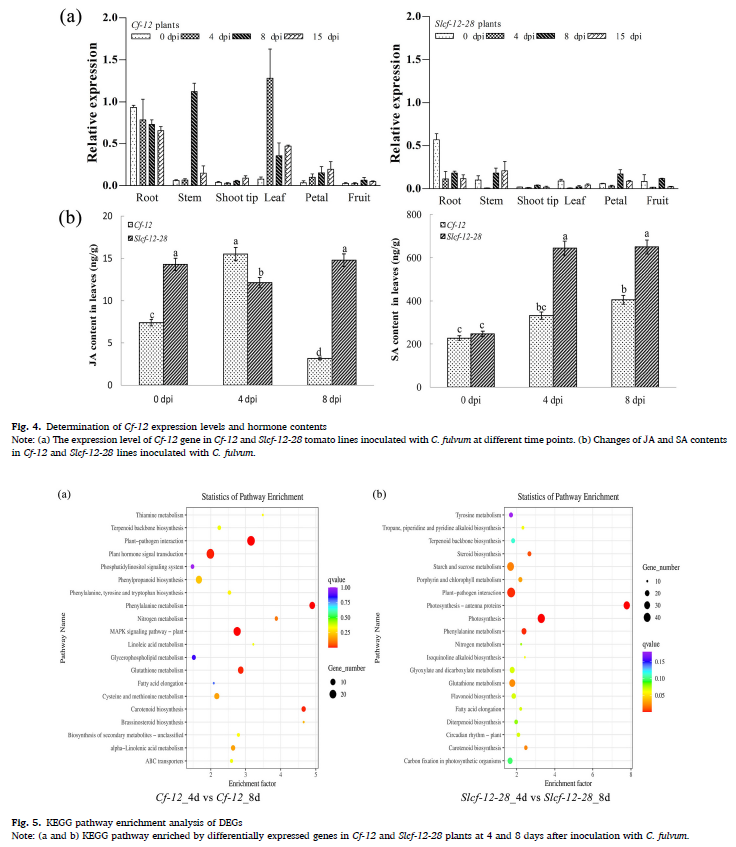 Cf-12基因的敲除株系,明确了接种叶霉菌后的活性氧积累情况、抗氧化酶活性、JA和SA含量,以及多时间点的转录水平差异。研究内容初步解析
