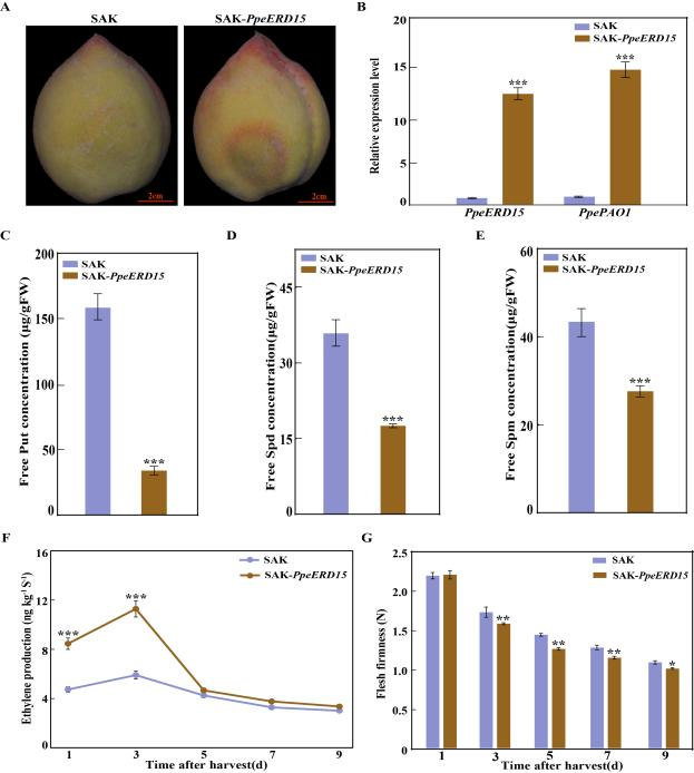 PpePAO1表达,促进多胺积累,抑制乙烯合成,增加果实硬度并延缓成熟;反之,过表达