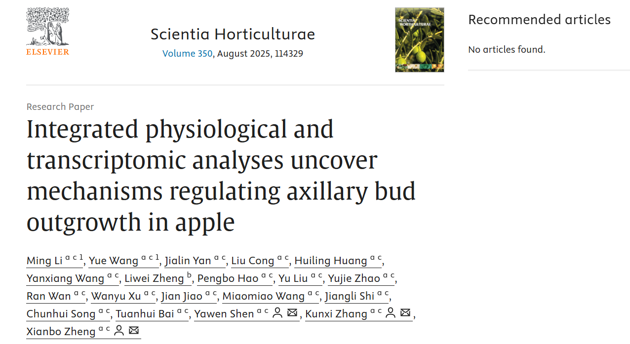 近日,河南农业大学园艺学院苹果逆境生物学与简约栽培技术体系研究团队在国际知名期刊Scientia Horticulturae(中科院2区TOP,IF 4.2)上发表了题为“Integrated Physiological and Transcriptomic Analyses Uncover Mechanisms Regulating Axillary Bud Outgrowth in Apple”的研究论文,在苹果苗木分枝机理研究方面取得了新的进展。