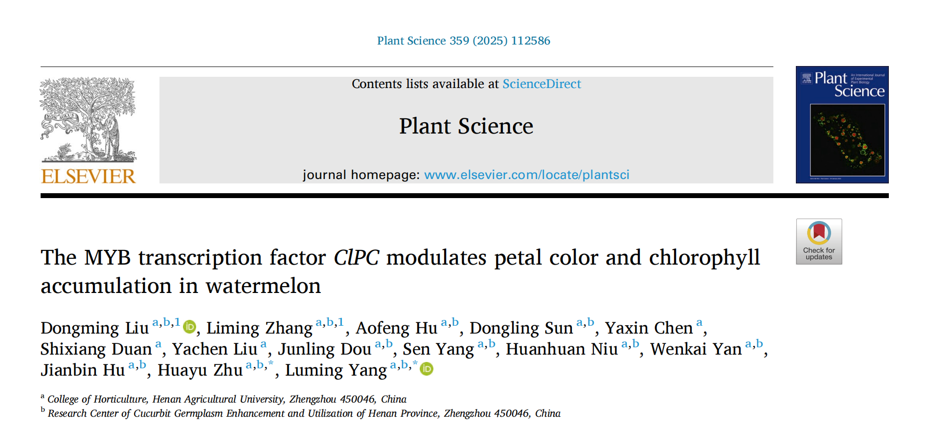 近日,河南农业大瓜类分子育种团队在园艺学领域权威期刊《Plant Science》上发表了题为“The MYB transcription factor ClPC modulates petal color and chlorophyll accumulation in watermelon”的研究论文。该研究首次揭示了MYB转录因子ClPC调控花瓣颜色的功能,丰富和完善了对植物花期颜色转变机制的了解,为提高西瓜制种效率和种子纯度提供了基因资源,在农业生产上具有重要应用价值。