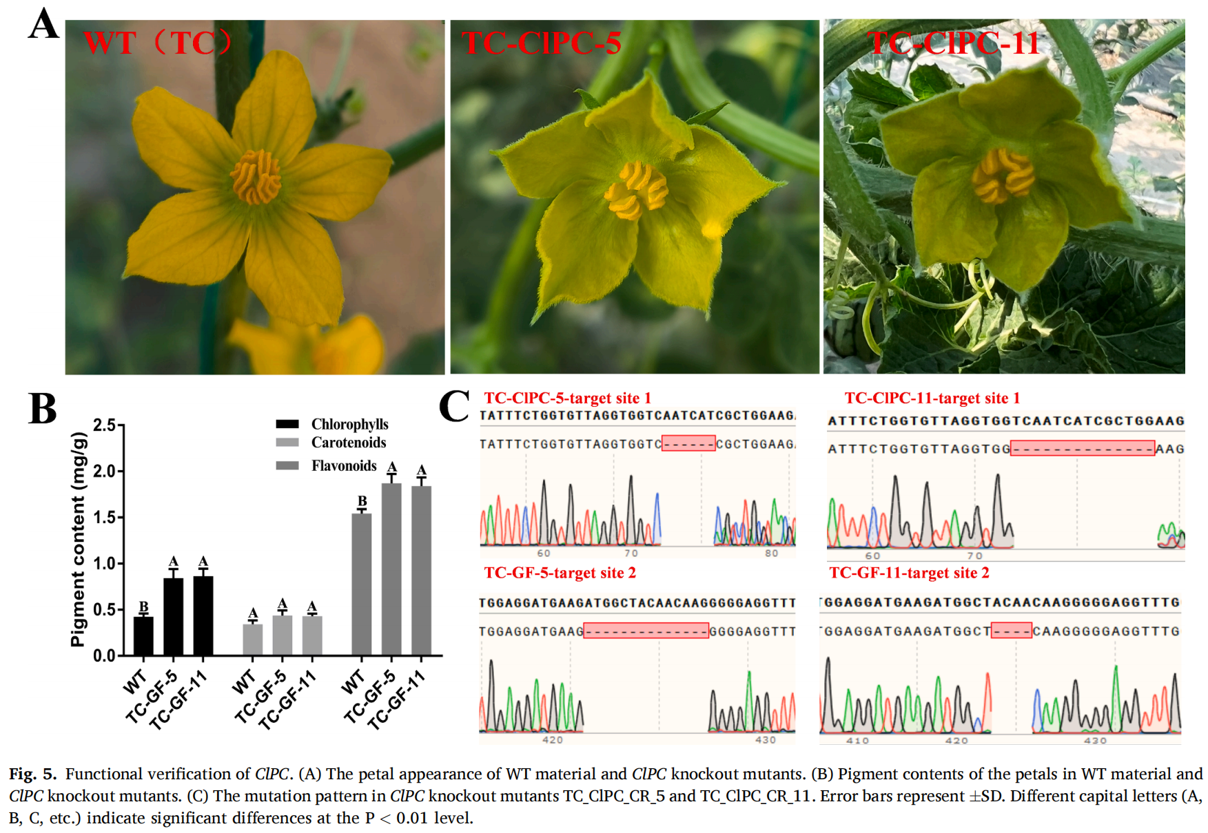 许多植物的花瓣开放前因含有高水平叶绿素而呈现绿色,花瓣开放后,叶绿素迅速降解,花瓣呈现出其它颜色,从而影响虫媒授粉作物的授粉吸引力和繁殖成功率。研究团队在搜集到一份黄绿色泽花瓣的新颖材料,其与普通西瓜种质材料的黄色花瓣表型表现出明显差异。利用F2群体进行的遗传分析表明,这种黄绿花瓣性状由单隐性基因控制;结合图位克隆方法,控制该特异性状的基因被定位到西瓜11号染色体上139.7 kb的区间内,其中编码MYB转录因子的Cla97C11G216460基因的碱基序列突变被确定为引起这一性状变异的关键因素。