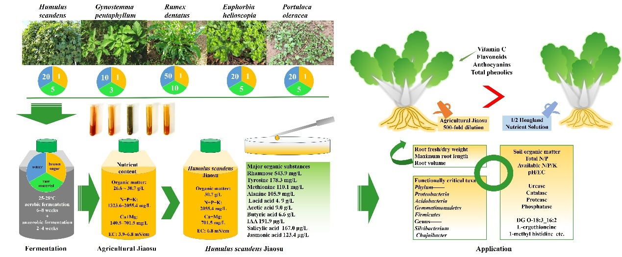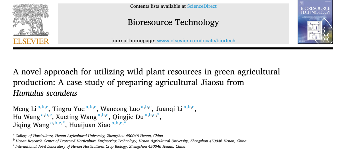 近日,河南农业大学园艺学院设施蔬菜栽培科技创新团队在环境科学与生态学领域一区TOP期刊《Bioresource Technology》(IF 9.0)上发表了题为《A novel approach for utilizing wild plant resources in green agricultural production: A case study of preparing agricultural Jiaosu from