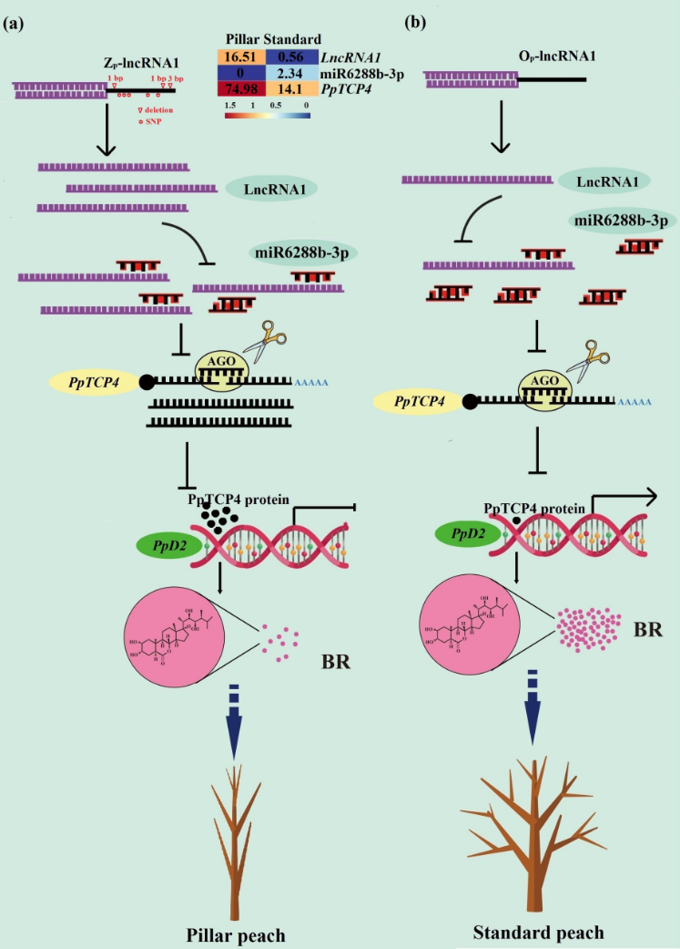 研究发现在柱型桃( ‘照手红’)中,lncRNA1启动子序列变异使其转录活性显著提高,高表达的lncRNA1通过竞争性结合miR6288b-3p的方式增加