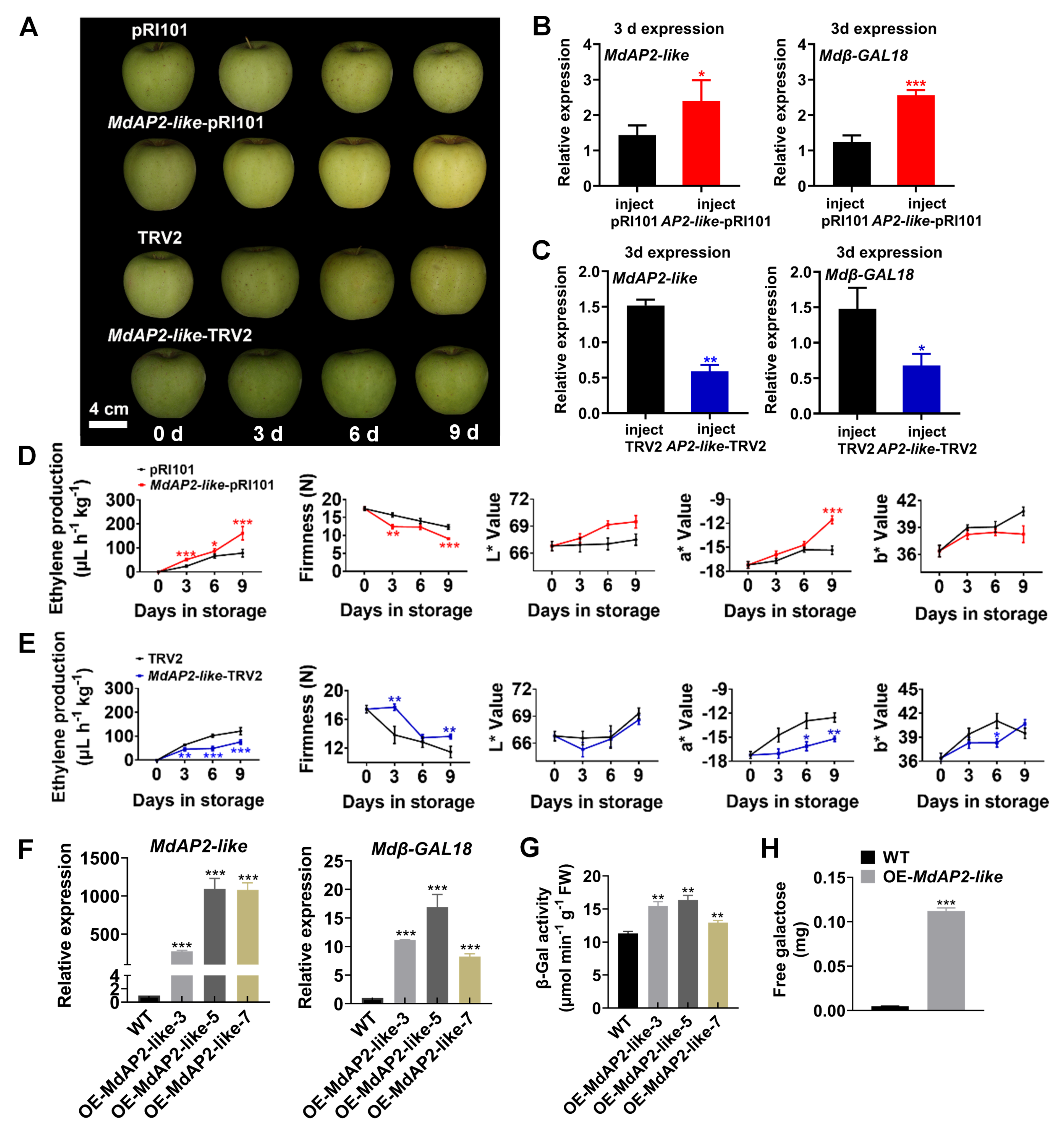 MdAP2-like能够显著提高果胶降解相关β-半乳糖苷酶(β-Gal)的活性和游离半乳糖的含量,且过表达