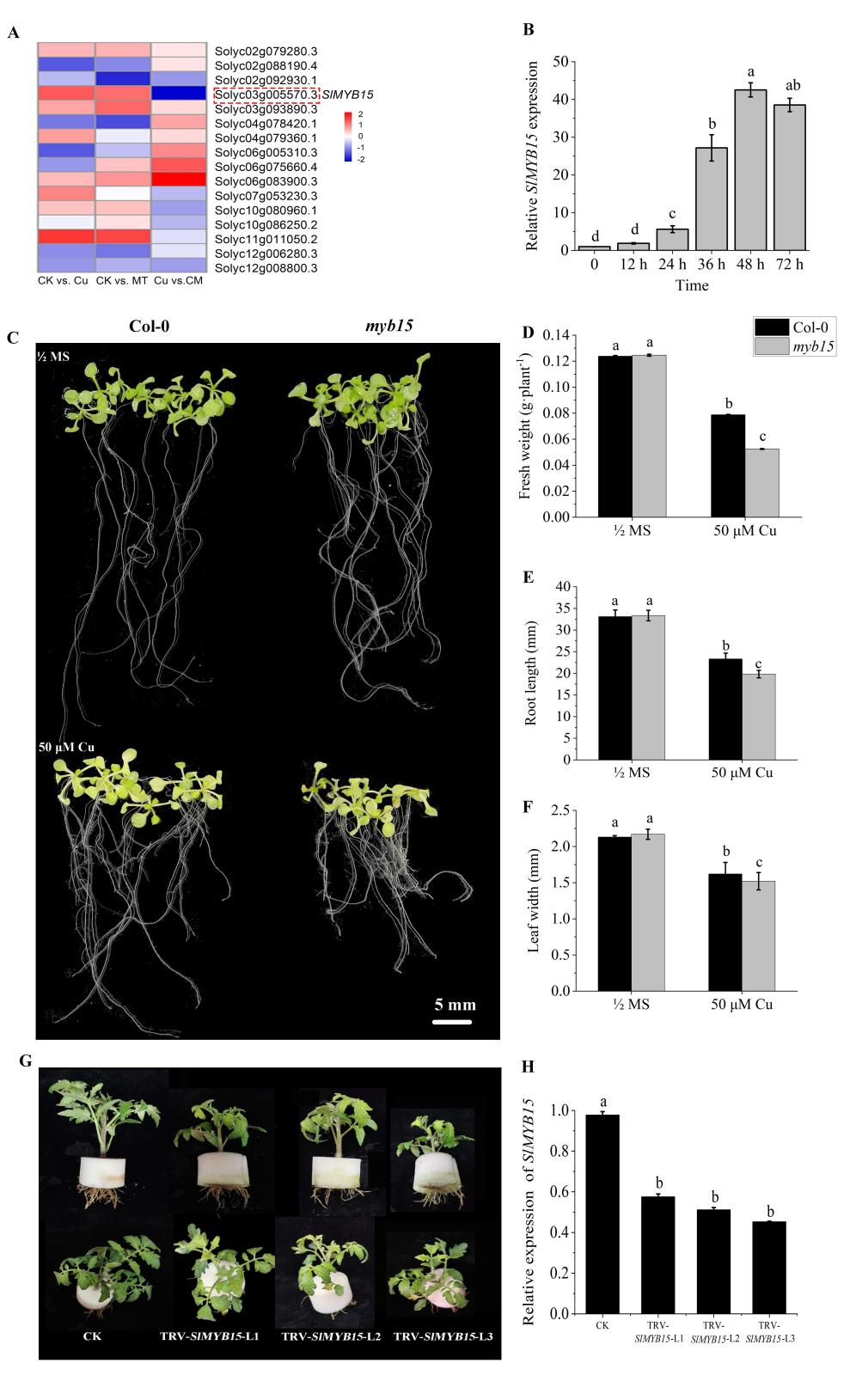 在众多受MT调控的基因中,转录因子SlMYB15引起了研究人员的关注。试验表明,SlMYB15在铜胁迫和MT处理下表达显著增加。通过对拟南芥同源基因突变体和番茄基因沉默实验,证实了SlMYB15在植物应对铜胁迫过程中发挥着重要作用。