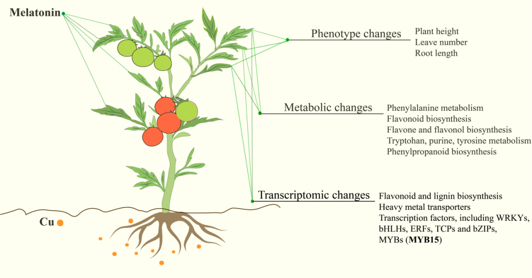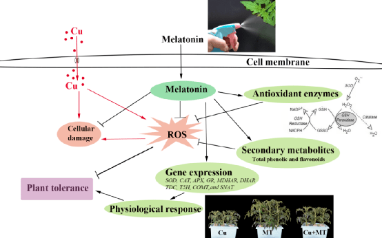铜作为植物生长所需的微量元素,其过度积累会对植物产生毒性,严重威胁全球作物的生产。褪黑素(N-乙酰-5-甲氧基色胺)是植物中的一种内源吲哚胺类化合物,在植物应对生物和非生物胁迫过程中起着重要作用。2022年的研究发现,褪黑素通过改善番茄幼苗的ROS代谢和抗氧化防御反应来缓解铜胁迫,但其具体作用机制尚不清晰。