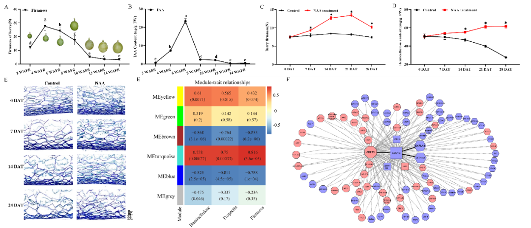 本研究发现转色前葡萄果实中生长素含量快速降低,外源NAA处理转色前葡萄延缓了果实的软化。进一步利用转录组的共表达差异基因与果实硬度等进行加权基因共表达网络(WGCNA)分析,结果显示