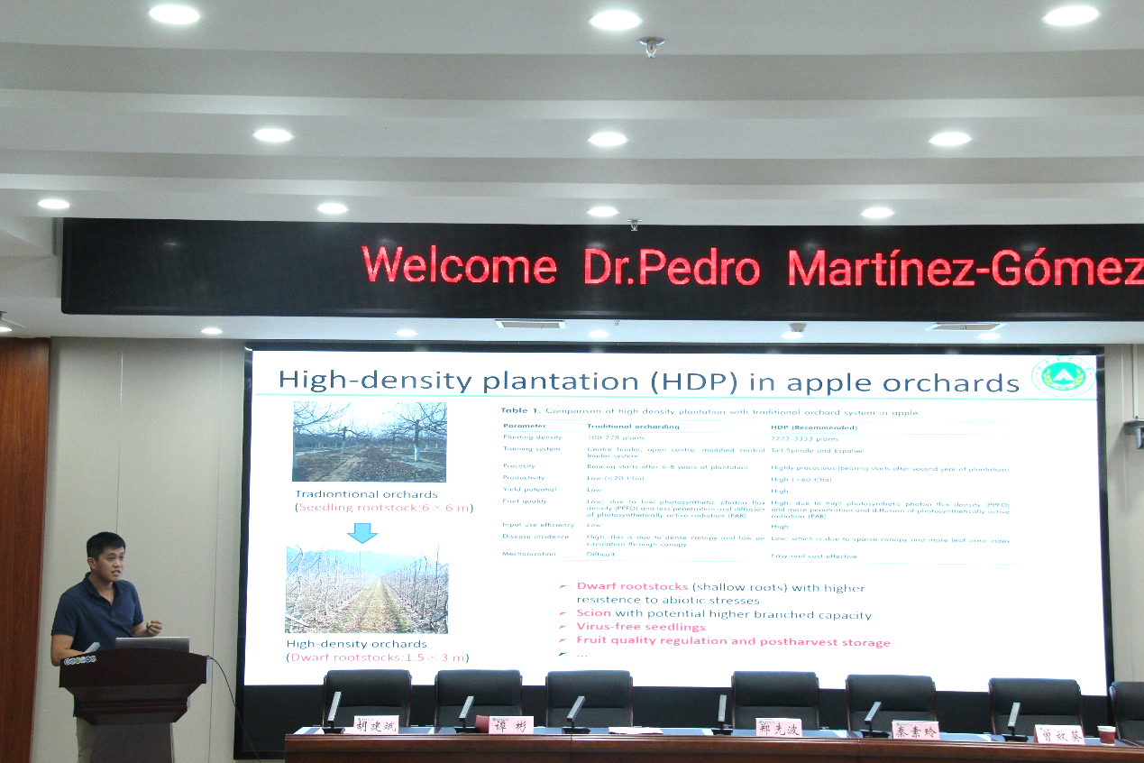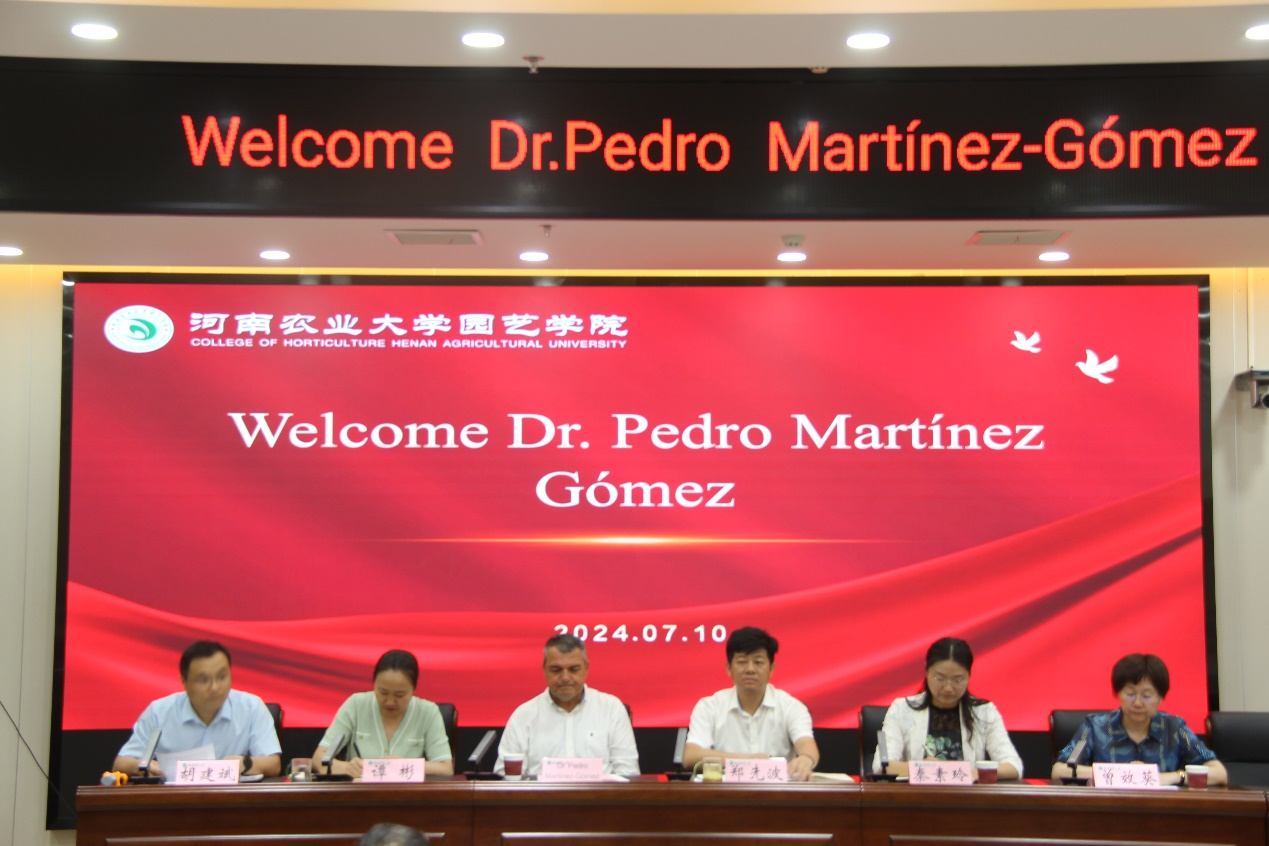 2024年7月10-11日,由河南农业大学园艺学院和河南省园艺植物生物学国际联合实验室主办的2024年度河南省园艺植物生物学国际联合实验室果树学术研讨会在力行楼北209报告厅举行。西班牙国家研究委员会(CSIC)的Pedro Martínez-Gómez教授应邀来校开展学术交流。学校国际交流合作处副处长曾效葵,学院党委书记秦素玲、院长郑先波、副院长胡建斌和副院长谭彬,及相关的专家学者出席了本次学术研讨会。研讨会由副院长胡建斌主持,园艺学院教职工及部分研究生聆听了报告。