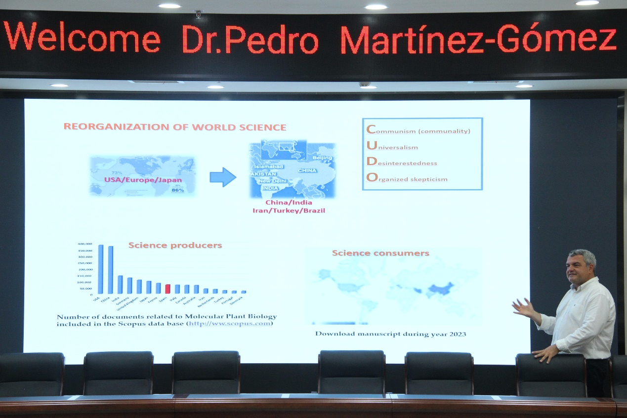 会议伊始,曾效葵副处长对Pedro教授的到来表示热烈欢迎。郑先波院长与Pedro教授签订双方合作协议,以加强双方在科学研究、人才培养等方面的合作。叶霞教授介绍了园艺学院的基本情况和科研成果,以及在国际交流与合作方面的相关工作。随后,Pedro教授受邀作了2场学术报告,题目分别是Application of molecular markers in the development and management of new Prunus varieties和Evaluation of scientific activity in the era of massive publishing and AI。Pedro教授首先介绍了西班牙国家研究委员会的基本情况,然后详细分析了全球李在栽培、销售等方面面临的挑战,并展示了其科研团队利用分子标记等技术进行李新品种培育和管理的科研成果。为了进一步提升年轻科研人员科研能力、论文写作能力和国际交流能力,Pedro教授在第2场报告中深入分析了国际学术论文发表的现状及未来发展趋势,并详细介绍了人工智能在科研和论文写作中的应用前景。