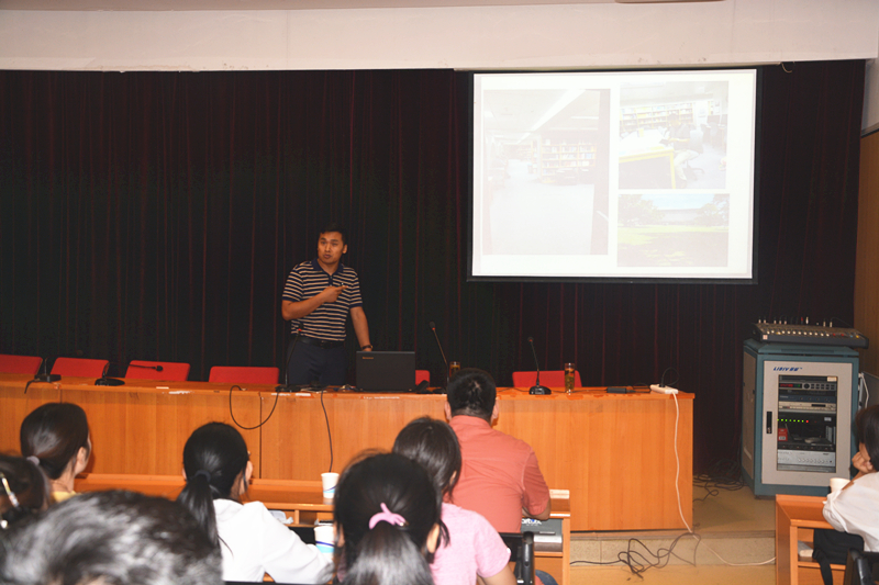 报告会上,白团辉副教授首先介绍了康奈尔大学和该校园艺系的基本情况以及在康奈尔大学访学期间的见闻。之后详细介绍了苹果抗逆和苹果柱型形成的分子机制研究进展,主要利用基因组学和分子生物学手段对抗逆相关基因的发掘和调控苹果树形的机理,并对相关基因进行功能验证。报告结束后,白团辉博士与现场师生就果树抗逆基因发掘及美国果树园区栽培技术进行了深入地讨论和交流。通过此次学术交流,大家对美国生活、实验条件以及产业现状有了比较直观的了解,对美国研究苹果抗逆和苹果柱型形成的分子机制相关研究技术及进展都有了深入的了解。