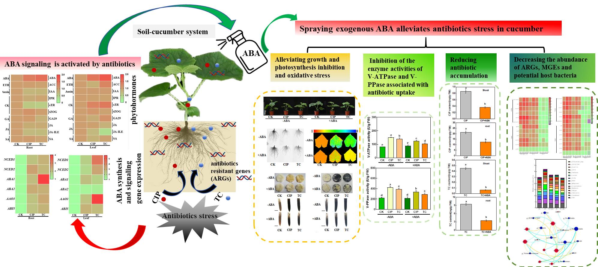 近日,河南农业大学园艺设施结构与环境研究团队的研究成果“Abscisic acid confers antibiotic stress tolerance in cucumber by alleviating antibiotic phytotoxicity and decreasing the levels of antibiotic and antibiotic resistance genes”在国际环境科学与工程领域知名期刊Journal of Hazardous Materials (中科院1区Top,IF=11.3)在线发表。研究揭示了植物激素脱落酸消减黄瓜抗生素污染的新功能。研究结果为有效消减土壤-植物系统中抗生素累积及抗生素抗性基因传播提供了新思路。